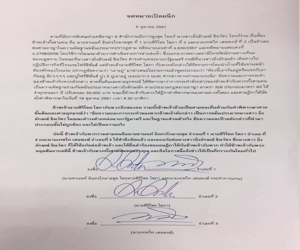 บัดนี้ ข้าพเจ้ากับพวกรวม 3 คน คือ นายชวนนท์ อินทรโกมาลสุต จำเลยที่ 1 นายศิริโชค โสภา จำเลย ที่ 2 และนายเทพไท เสนพงษ์ จำเลยที่ 3 ได้สำนึกผิดแล้ว และขออภัยต่อ น.ส.ยิ่งลักษณ์ ชินวัตร ซึ่ง น.ส. ยิ่งลักษณ์ ชินวัตร ก็ได้ให้อภัยต่อข้าพเจ้า และได้ยื่นคำร้องขอถอนฎีกาให้กับข้าพเจ้ากับพวก ทำให้ข้าพเจ้ากับพวกหลุดพ้นจากคดีนี้ ข้าพเจ้ากับพวกทั้ง 3 คนขอขอบคุณ และถือโอกาสนี้แจ้งข่าวให้เป็นที่ทราบกันโดยทั่วไป.-สำนักข่าวไทย