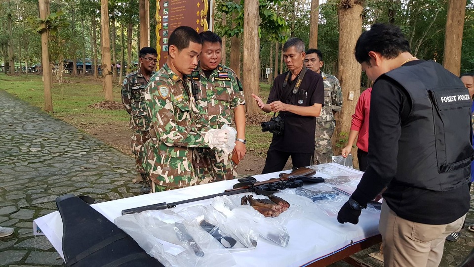 กรณีชุดเจ้าหน้าที่อุทยานแห่งชาติไทรโยค จ.กาญจนบุรี เข้าตรวจสอบคณะรถยนต์ออฟโรด 6 คัน บริเวณพื้นที่หน่วยพิทักษ์อุทยานแห่งชาติไทรโยค (เขาพลู) ช่วงสายวันนี้ (7 ต.ค.) โดยพบว่ามีกลุ่มบุคคลร่วมคณะเดินทางมาประมาณ 15 คน ในนี้มีเด็ก 3 คน และการตรวจสอบเบื้องต้นพบอาวุธปืนไรเฟิลติดลำกล้องและอุปกรณ์เก็บเสียง 1 กระบอก กระสุนปืนจำนวนหนึ่ง รวมทั้งปืนพกสั้นพร้อมกระสุน และอุ้งเท้าหมีขอ ซึ่งนายพนัชกร โพธิบัณฑิต หัวหน้าอุทยานแห่งชาติไทรโยค ได้รายงานผู้บังคับบัญชาไปตามขั้นตอน เนื่องจากบุคคลในคณะดังกล่าวมีการอ้างตัวเป็นเจ้าหน้าที่ คือ นายวัชรชัย สมีรักษ์ ปลัดอำเภอด่านมะขามเตี้ย และชายอีกสองคนอ้างเป็นเจ้าหน้าที่อาสารักษาดินแดนด้วย ทางอุทยานฯ จึงนำคณะออฟโรดทั้งหมดมาทำบันทึกจับกุมยังที่ทำการอุทยานฯ