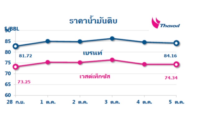 บมจ.ไทยออยล์คาดราคาน้ำมันดิบเวสต์เท็กซัสสัปดาห์นี้จะทรงตัวระดับสูงเคลื่อนไหวที่กรอบ 75 – 80 เหรียญสหรัฐฯ ต่อบาร์เรล ส่วนน้ำมันดิบเบรนท์เคลื่อนไหวที่กรอบ 84 – 89 เหรียญสหรัฐต่อบาร์เรล ราคาน้ำมันดิบเบรนท์ปรับตัวลดลง จากแรงเทขายทำกำไร หลังราคาน้ำมันดิบแตะระดับสูงสุดในรอบ 4 ปีเมื่อวันพุธที่ผ่านมา