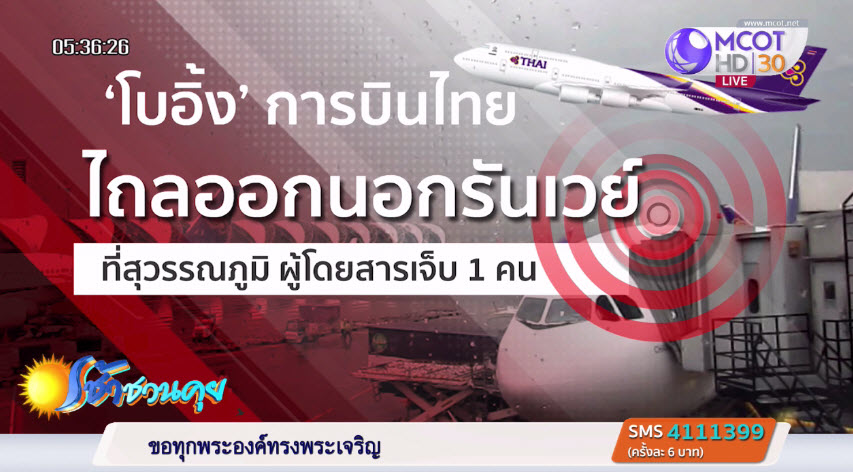 สุวรรณภูมิ 9 ต.ค.-เครื่องบินโดยสาร โบอิ้ง 747-400 เที่ยวบิน ทีจี 679 กวางโจว-กรุงเทพฯ ของสายการบินไทย ไถลออกนอกรันเวย์สนามบินสุวรรณภูมิ เมื่อเวลา 23.30 น.ที่ผ่านมา ผู้โดยสารบาดเจ็บ 1 คน