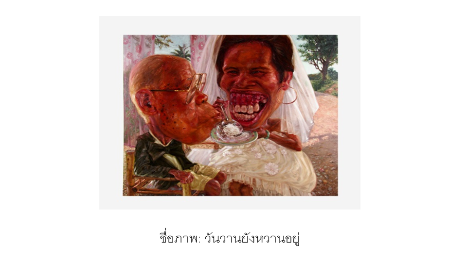 งานศิลปะสื่อสารมุมมองความรักที่มักเลือกอยู่กับคนที่มองเห็น โดยมองข้ามความน่ารังเกียจและสังขารที่เหี่ยวย่น ที่ลำพู กันเสนาะ ศิลปินชื่อดังต้องการสะท้อนผ่านผลงาน “วันวานยังหวานอยู่”ใช้ปลายพู่กันบรรจงละเลงสีน้ำมันบนผ้าใบโดยวิธีการยืด หด ขยายผู้คน วัตถุเเละสิ่งเเวดล้อมเพื่อเพิ่มความรู้สึกของภาพให้ดูสมจริง เเม้เรื่องราวของภาพจะดูตลกขบขันเเต่กลับทำให้ผู้ที่พบเห็นได้พบคุณค่าของการมีชีวิตอยู่อย่างมีความสุขเเละสะท้อนว่าทุกคนต่างล้วนเเสวงหาความเป็นมนุษย์ที่สมบูรณ์เเบบเฉกเช่นเดียวศิลปินที่ถ่ายทอดความสุขผ่านงานศิลปะ เเละได้รับรางวัลเหรียญทองเเดงจากการแสดงศิลปกรรมแห่งชาติ ครั้งที่ 54