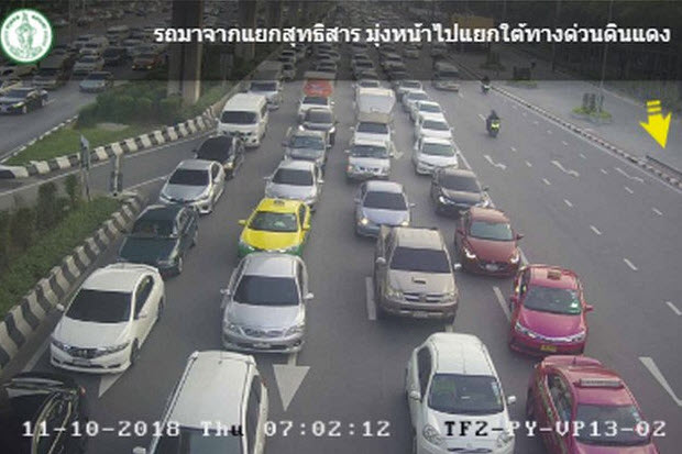 กทม. 11 ต.ค.-สวพ.FM91 รายงานจราจรเช้าวันพฤหัสบดี ถนนวิภาวดี-รังสิต ขาเข้า จากแยกสุทธิสาร มุ่งหน้าใต้ด่วนดินแดง รถมาก