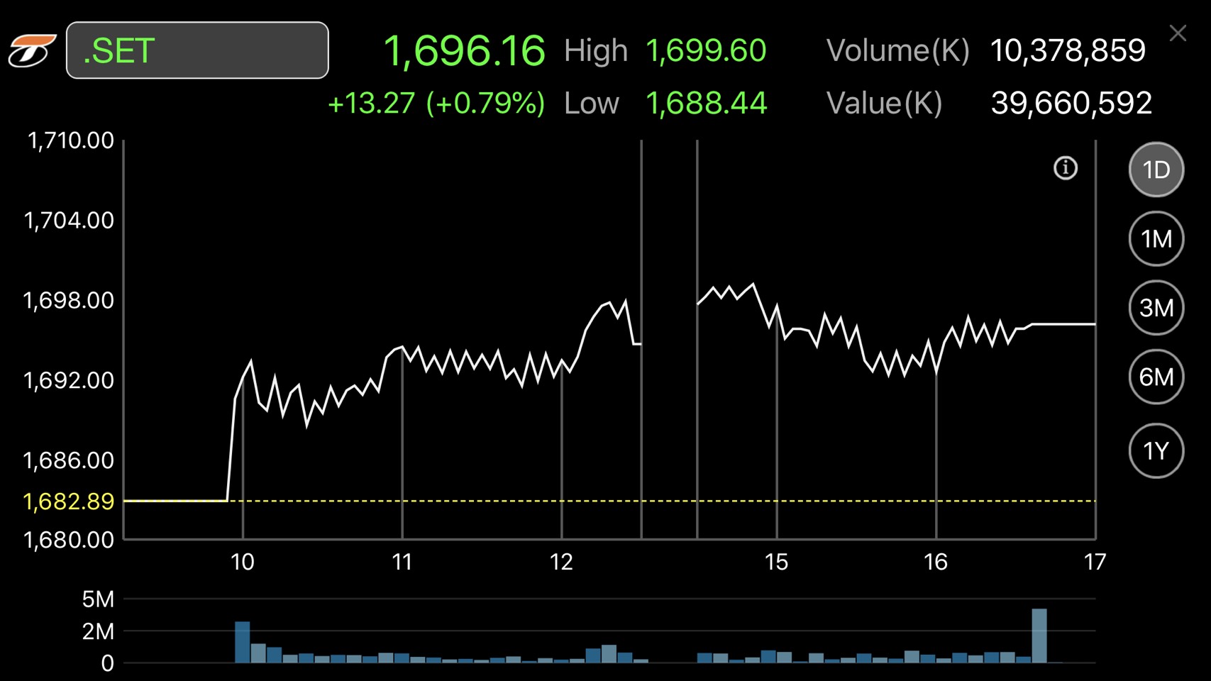 ผู้สื่อข่าวรายงานว่าดัชนีตลาดหลักทรัพย์ฯ ปิดวันนี้ (12 ต.ค.) ที่ระดับ 1,696.16 จุด เพิ่มขึ้น 13.27 จุด หรือร้อยละ 0.79 มูลค่าการซื้อขาย 39,660.59 ล้านบาท การซื้อขายหุ้นวันนี้ดัชนีหุ้นไทยเคลื่อนไหวแดนบวกตลอดทั้งวัน โดยดัชนีฯ แตะจุดสูงสุดที่ 1,699.60 จุด และแตะจุดต่ำสุดที่ระดับ 1,688.44 จุด