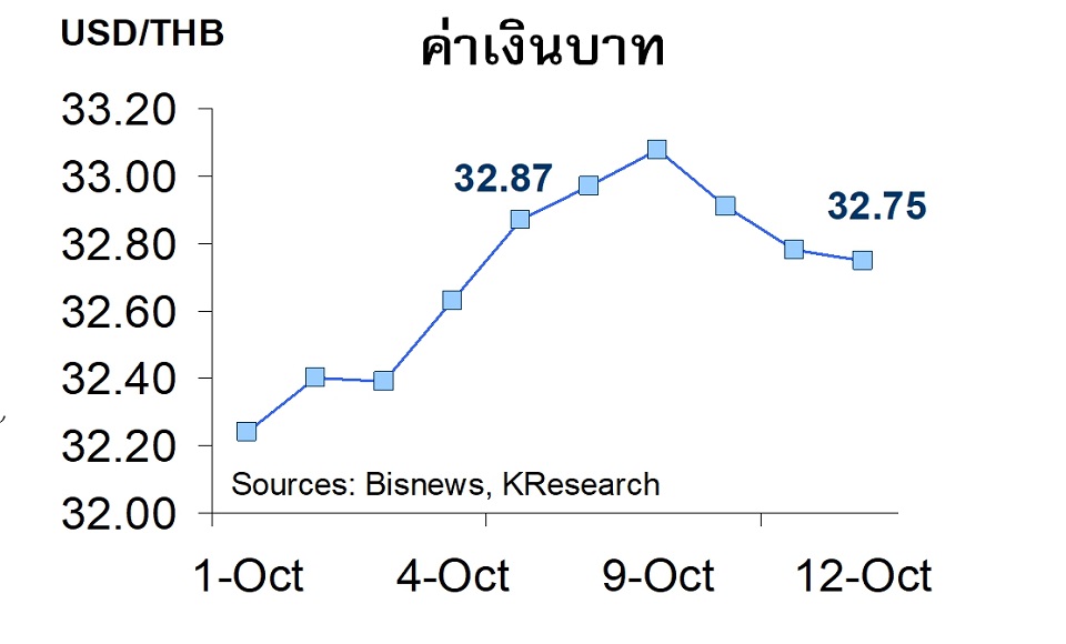 สำหรับสัปดาห์ถัดไป (15-19 ต.ค.) ธนาคารกสิกรไทยประเมินกรอบการเคลื่อนไหวของเงินบาทที่ 32.50-32.90 บาทต่อดอลลาร์ฯ โดยปัจจัยที่ตลาดรอติดตาม ได้แก่ สถานการณ์ความขัดแย้งระหว่างสหรัฐฯ และจีน รายงานนโยบายอัตราแลกเปลี่ยนของประเทศคู่ค้าสำคัญของสหรัฐฯ ถ้อยแถลงของเจ้าหน้าที่ระดับสูงของเฟด และบันทึกการประชุมเฟด (25-26 ก.ย.) ขณะที่ ข้อมูลเศรษฐกิจสหรัฐฯ ที่สำคัญในระหว่างสัปดาห์ ประกอบด้วย ยอดค้าปลีก ยอดขายบ้านมือสอง ผลผลิตภาคอุตสาหกรรม ข้อมูลการเริ่มสร้างบ้านเดือนก.ย. ผลสำรวจกิจกรรมการผลิตของเฟดสาขานิวยอร์กและเฟดสาขาฟิลาเดลเฟีย ดัชนีภาวะตลาดบ้านเดือนต.ค. รวมถึงข้อมูลยอดถือครองพันธบัตรรัฐบาลสหรัฐฯ ของต่างชาติเดือนส.ค. นอกจากนี้ ตลาดในประเทศอาจรอติดตามผลประกอบการไตรมาส 3/2561 ของบจ. และสัญญาณเงินทุนเคลื่อนย้ายของนักลงทุนต่างชาติ เพิ่มเติมด้วยเช่นกัน