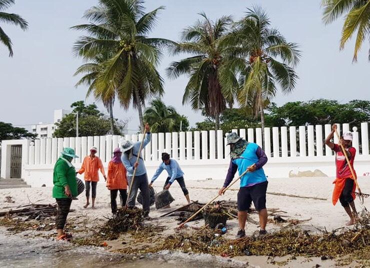 นายจีรวัฒน์ พราหมณี ปลัดเทศบาลเมืองหัวหิน จ.ประจวบคีรีขันธ์ พร้อมเจ้าหน้าที่กองสาธารณสุขและสิ่งแวดล้อม นำอุปกรณ์เก็บซากขยะกว่า 4 ตัน ตามแนวชายหาดไปจนถึงชายหาดบ้านหัวดอนชุมชนตะเกียบระยะทางกว่า 10 กิโลเมตร เพื่อรักษาสิ่งแวดล้อมและสร้างความสะอาดของแหล่งท่องเที่ยว ซึ่งเศษขยะและกิ่งไม้ดังกล่าวถูกลมมรสุมพัดเข้าชายฝั่งช่วง 3-5 วันที่ผ่านมา ขณะเดียวกันเจ้าหน้าที่เทศกิจยังคงแจ้งเตือนนักท่องเที่ยวให้ระวังแมงกะพรุนขณะลงเล่นน้ำทะเล