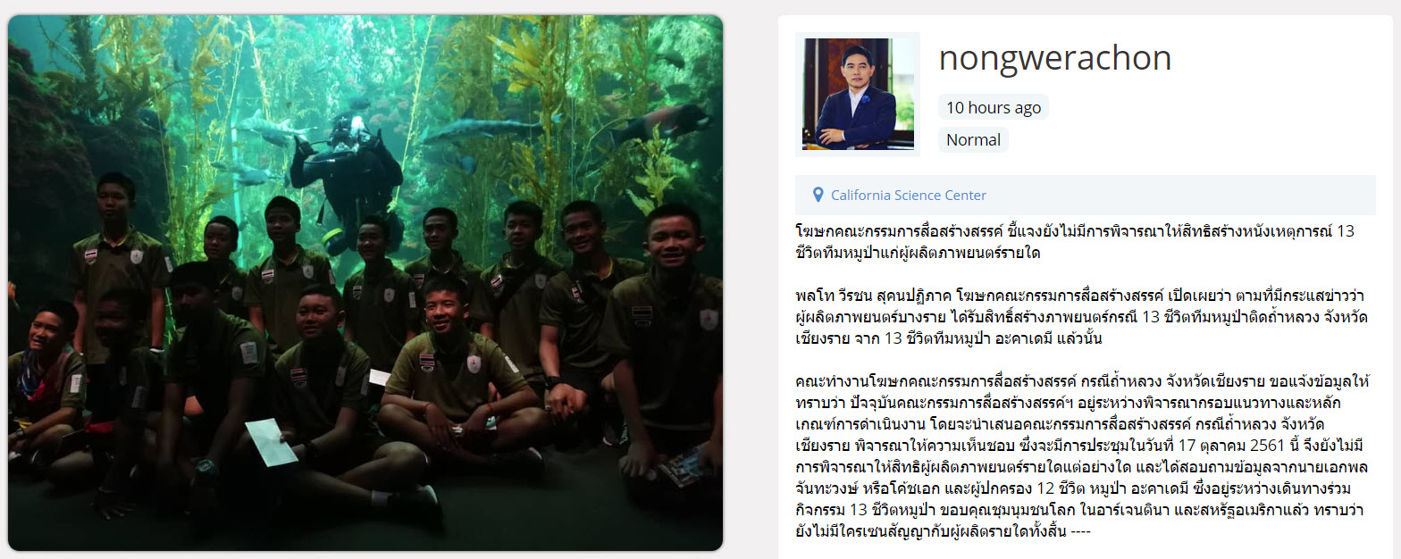 คณะทำงานโฆษกคณะกรรมการสื่อสร้างสรรค์ กรณีถ้ำหลวง จ.เชียงราย ขอแจ้งข้อมูลให้ทราบว่า ปัจจุบันคณะกรรมการสื่อสร้างสรรค์ฯ อยู่ระหว่างพิจารณากรอบแนวทางและหลักเกณฑ์การดำเนินงาน โดยจะนำเสนอคณะกรรมการสื่อสร้างสรรค์ กรณีถ้ำหลวง จ.เชียงราย พิจารณาให้ความเห็นชอบ ซึ่งจะมีการประชุมในวันที่ 17 ตุลาคม 2561 นี้ จึงยังไม่มีการพิจารณาให้สิทธิผู้ผลิตภาพยนตร์รายใดแต่อย่างใด และได้สอบถามข้อมูลจากนายเอกพล จันทะวงษ์ หรือโค้ชเอก และผู้ปกครอง 12 ชีวิต หมูป่าอะคาเดมี ซึ่งอยู่ระหว่างเดินทางร่วมกิจกรรม 13 ชีวิตหมูป่า ขอบคุณชุมนุมชนโลก ในอาร์เจนตินา และสหรัฐอเมริกาแล้ว ทราบว่ายังไม่มีใครเซ็นสัญญากับผู้ผลิตรายใดทั้งสิ้น