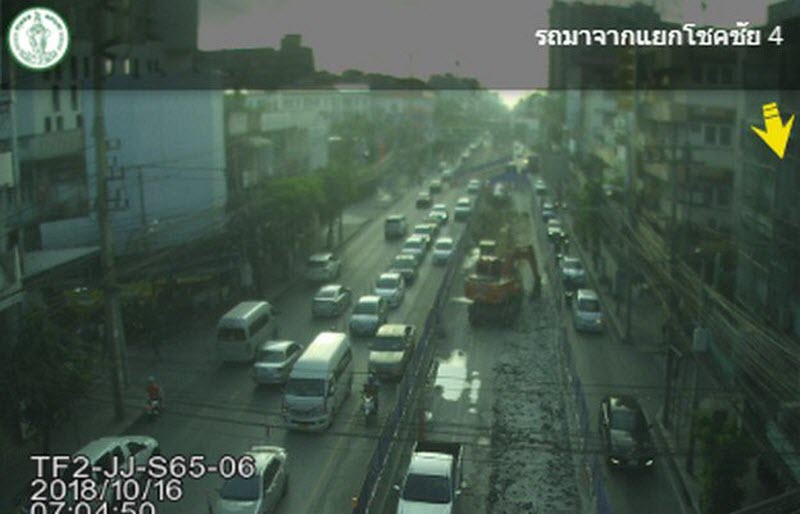 ถนนลาดพร้าว ขาเข้า เบี่ยงแนวก่อสร้างรถไฟฟ้าสายสีเหลือง ช่วงลาดพร้าว-สำโรง ขาเข้า ช่องปกติ วิ่งได้ 1 ช่องทาง ช่องพิเศษวิ่งได้ 2 ช่องทาง และขาออก คงเหลือวิ่งได้ 2 ช่องทาง การจราจรเมื่อเวลา 07.07 น. ขาเข้า รถชะลอตัว ท้ายสะสมต่อเนื่องแยกมหาดไทย ขาออก รถน้อย คล่องตัว