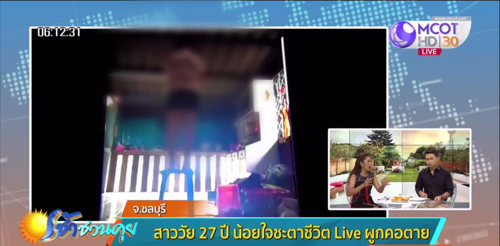 นี่คือภาพของผู้ใช้เฟซบุ๊กรายหนึ่งจะเห็นการถ่ายทอดสด มีภาพผู้หญิงเอาโทรศัพท์มาวางไว้ เดินไปมามีเสียงร้องไห้ บอกว่าไม่ไหวแล้ว โดยมีเนื้อหาบนหน้าเฟซบุ๊กว่า ขอโทษพ่อแม่… ผู้หญิงคนดังกล่าวได้ใช้เชือกผูกบนขื่อและเอาเก้าอี้วางรอง จากนั้นขึ้นไปยืนบนเก้าอี้พลาสติก ใช้มือดึงเชือกมาคล้องคอแล้วเอาออก เดินลงมาจากเก้าอี้ 2 ครั้ง แล้วภาพก็หายไป ซึ่งต่อมาคลิปสดดังกล่าวได้ถูกลบออกไป โดยเหตุเกิดเมื่อเวลา 15.00 น. วันที่ 15 ต.ค.61