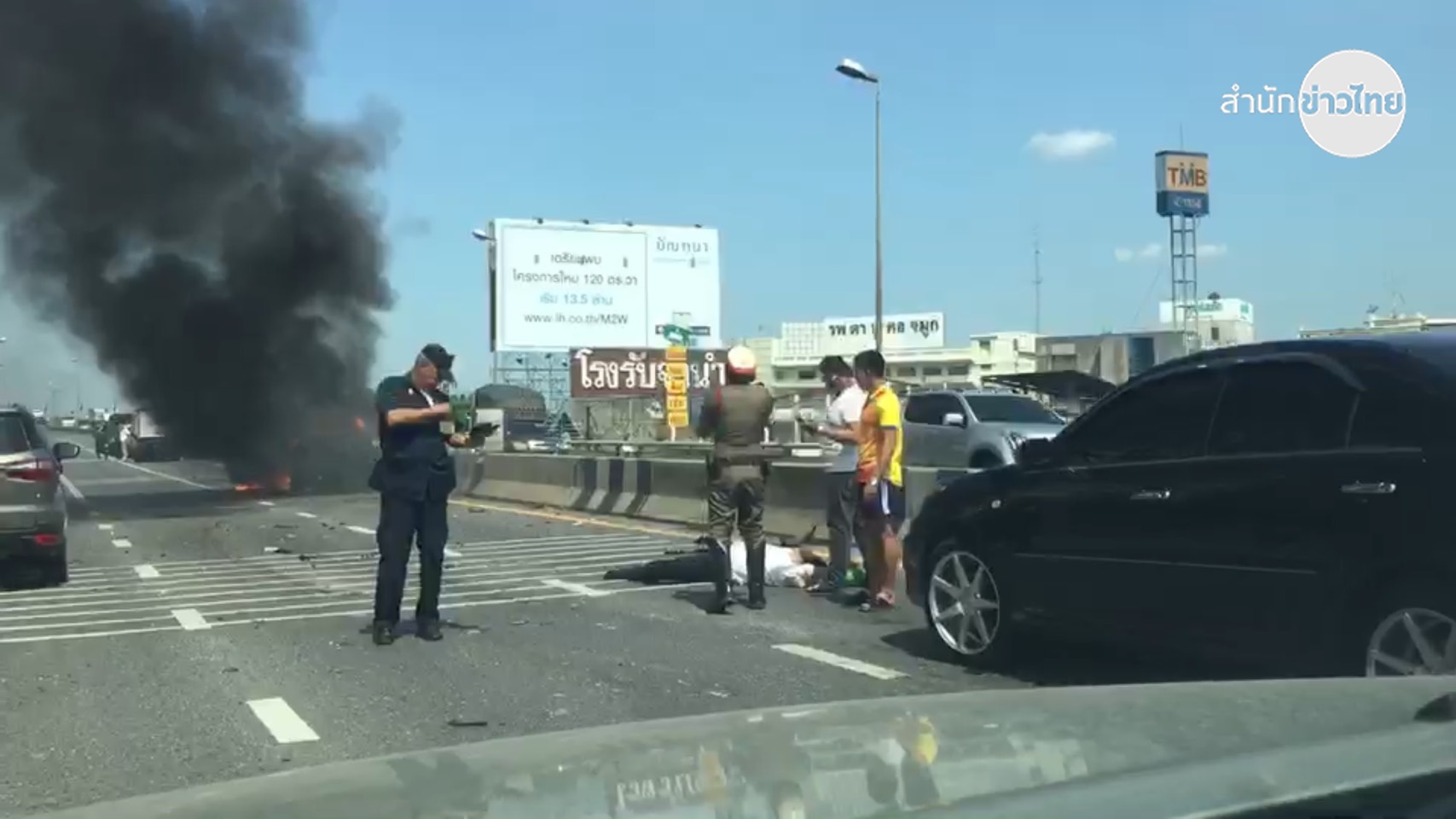 กทม.17 ต.ค.- 2 ฮีโร่วันตำรวจ ช่วยคนเจ็บออกจากซากรถอย่างเฉียดฉิว หลังเก๋งอาจารย์ชนท้ายกระบะ ไฟลุกท่วม บนทางคู่ขนานลอยฟ้า