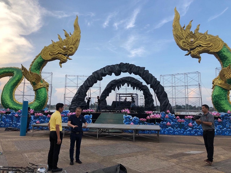 หนองคาย 18 ต.ค.- เที่ยวงานบุญออกพรรษาหนองคาย 21-24 ต.ค.นี้ จัดอลังการกว่าทุกปี เวทีการแสดงแสงสีเสียงตำนานบั้งไฟพญานาค ฉากหลังพญานาคคู่แลนด์มาร์คริมโขง เพิ่มสีสันรอชมลูกไฟผุดกลางน้ำ