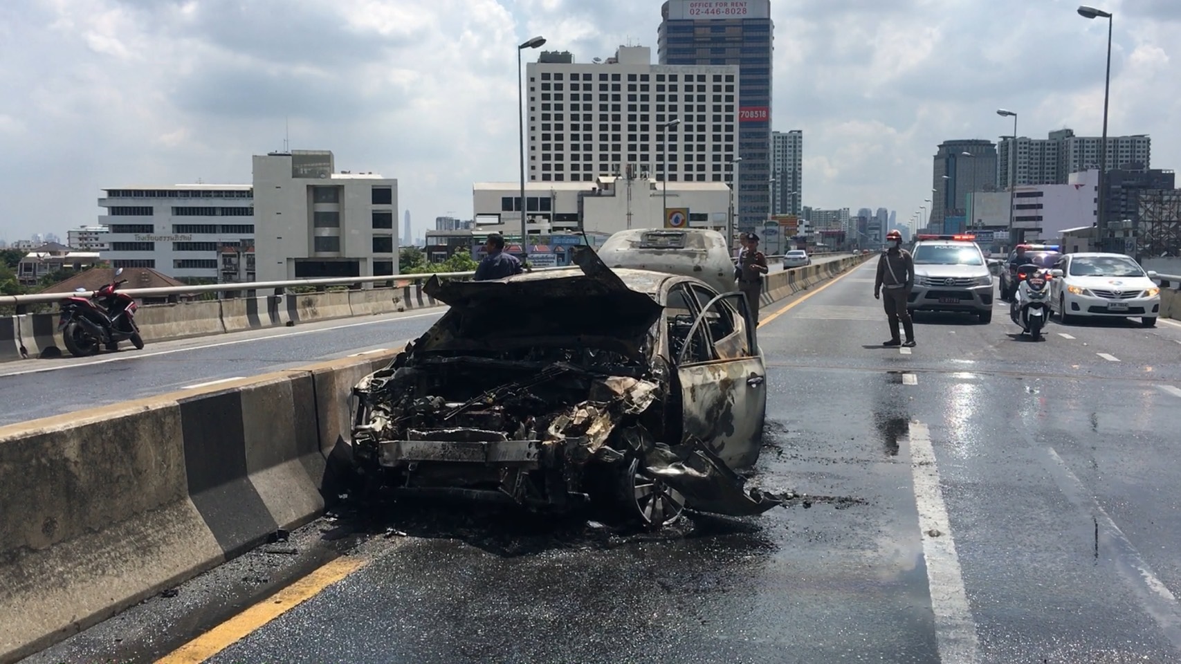 พันตำรวจโทณัฐนันท์ ม่วงงาม สารวัตรสอบสวน งานสายตรวจ 3 สถานีตำรวจนครบาลคู่ขนานลอยฟ้า เปิดเผยความคืบหน้าความคืบหน้าการเกิดอุบัติเหตรถยนต์นิสสันเทียน่าชนกับรถยนต์กระบะแล้วเกิดเพลิงลุกไหม้บนทางคู่ขนานลอยฟ้าบรมราชชนนีเมื่อวานนี้(17 ต.ค.) ทำให้นายรัฏฐกานต์ โกมลรัตน์ อายุ 40 ปี อาจารย์มหาวิทยาลัยมหิดล คนขับรถยนต์ได้รับบาดเจ็บสาหัสและเสียชีวิตในเวลาต่อมา ส่วนคนขับรถกระบะคู่กรณียังรักษาตัวอยู่ที่โรงพยาบาลว่า พนักงานสอบสวนได้ส่งศพนายรัฏฐกานต์ ไปชันสูตรหาสาเหตุการเสียชีวิตที่นิติเวช โรงพยาบาลศิริราชแล้ว เบื้องต้นทางโรงพยาบาลเจ้าพระยาระบุสาเหตุ เกิดจากการเสียเลือดมาก และได้รับบาดเจ็บจากการกระทบกระเทือนภายในอย่างหนักส่วนคนขับรถกระบะ ศรีษะแตกต้องเย็บแผลกว่า 10 เข็ม จากการสอบปากคำเบื้องต้น ให้การว่า ขณะขับรถอยู่เลนขวาก่อนถึงจุดเกิดเหตุ รถยนต์คันดังกล่าวขับมาชนท้ายอย่างแรงก่อนเกิดไฟลุกไหม้ จากการตรวจสอบที่เกิดเหตุ ไม่พบรอยเบรคของรถยนต์ แต่มีร่องรอยการพุ่งเข้าชนท้ายอย่างแรงของรถ เพราะรถยนต์พุ่งชนในลักษณะมุดเข้าไปท้ายรถกระบะรวมทั้งมีรอยขูดบนถนน ส่วนกล้องวงจรปิดโดยรอบไม่สามารถบันทึกเหตุการณ์ไว้ได้ เพราะกล้องอยู่นอกรัศมีการบันทึกเหตุการณ์ จนถึงขณะนี้ ยังไม่ได้ตั้งข้อหากับบุคคลใด แต่ได้นัดหมายให้คนขับรถกระบะคู่กรณีมาให้ปากคำเพิ่มเติมที่สถานีตำรวจนครบาลคู่ขนานลอยฟ้า หลังออกจากโรงพยาบาล ส่วนญาตินายรัฏฐกานต์ ยังไม่ติดต่อเข้าพบพนักงานสอบสวน เพราะอยู่ระหว่างจัดการเรื่องงานศพ เบื้องต้นหลังจากรับศพที่นิติเวชโรงพยาบาลศิริราช จะนำไปประกอบพิธีทางศาสนาคริสต์ที่จังหวัดเชียงใหม่