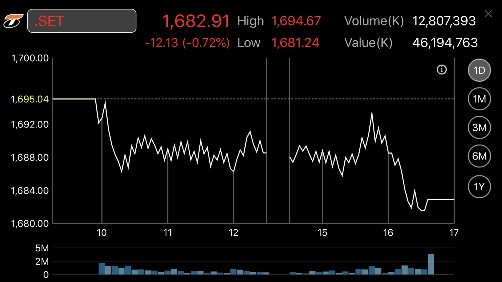 ผู้สื่อข่าวรายงานว่าดัชนีตลาดหลักทรัพย์ฯ ปิดการซื้อขายที่ระดับ 1,682.91 จุด ลดลง 12.13 จุด หรือร้อยละ 0.72 มูลค่าการซื้อขาย 46,194.76 ล้านบาท การซื้อขายหุ้นไทยวันนี้ (18 ต.ค.) ดัชนีเคลื่อนไหวแดนลบตลอดทั้งวัน โดยดัชนีสูงสุดของวันที่ระดับ 1,694.67 จุด และต่ำสุดที่ 1,681.24 จุด