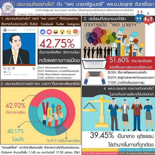 ผู้สื่อข่าวรายงานว่า สวนดุสิตโพล มหาวิทยาลัยสวนดุสิต เผยผลสำรวจความคิดเห็นประชาชน ในหัวข้อ ประชาชนคิดอย่างไร กับ “เพจ นายกรัฐมนตรี” พล.อ.ประยุทธ์ จันทร์โอชา ที่ได้เปิดตัวเพื่อเป็นช่องทางสื่อสารกับประชาชนทั้ง เว็บไซต์ เฟซบุ๊ก ทวิตเตอร์ อินสตาแกรม โดยสำรวจความเห็นจากประชาชนทั่วประเทศ จำนวน 1,165 คน ระหว่างวันที่ 17- 20 ตุลาคม 2561
