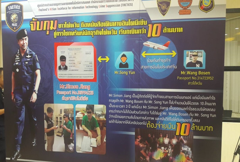 จากการสืบสวน ทราบว่าผู้ต้องหาถือสัญชาติใต้หวัน แต่ใช้หนังสือเดินทางประเทศอินโดนิเซียเข้ามาในประเทศไทย จึงขออนุมัติศาลออกหมายจับนายไซม่อน เจียง ในข้อหาหมิ่นประมาทและ กรรโชกทรัพย์ ก่อนจับกุมตัวได้ย่านดอนเมือง เมื่อวันที่ 20 ตุลาคมที่ผ่านมา จากการตรวจสอบยังพบว่าผู้ต้องหามีประวัติเป็นหัวหน้าแก๊งค้ามนุษย์ ฉ้อโกง ปลอมแปลงเอกสารและหนังสือเดินทางที่ประเทศไต้หวัน และยังมีผู้ร่วมขบวนการที่อยู่ต่างประเทศซึ่งเจ้าหน้าที่อยู่ระหว่างขยายผลจับกุม