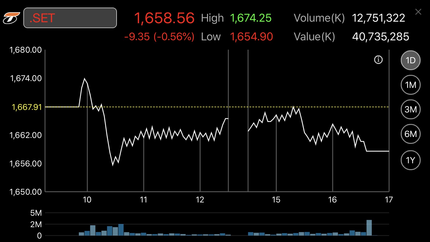 การซื้อขายหุ้นวันนี้ ดัชนีหุ้นไทยเคลื่อนไหวในแดนลบเป็นส่วนใหญ่ โดยดัชนีฯแตะจุดสูงสุดที่ 1,674.25 จุด และแตะจุดต่ำสุดที่ระดับ 1,654.90 จุด