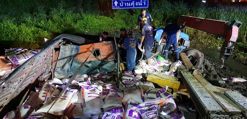 คนขับรถพ่วงให้การเบื้องต้นว่า กำลังจะกลับบริษัทและแล่นตามหลังรถสิบล้อบรรทุกอาหารสัตว์ แต่ปรากฏว่ารถตัวเองมีอาการล้อผิดปกติส่ายไปมา จึงรีบเบรก แต่ไม่อยู่ และเข้าชนท้ายรถสิบล้อก่อนจะตกลงไปในร่องน้ำข้างทางทั้งสองคัน.-สำนักข่าวไทย