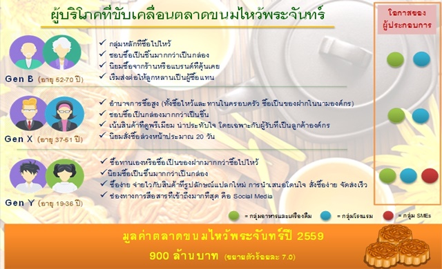 ส่วนในระยะถัดไป กลุ่มลูกค้าที่ไม่ควรมองข้าม คือ กลุ่ม Gen Y แม้ว่าปัจจุบันจะไม่ใช่กลุ่มเป้าหมายหลักของขนมไหว้พระจันทร์ในการซื้อเพื่อไปไหว้ แต่จะเป็นตลาดสำหรับการซื้อไปรับประทานหรือซื้อไปเป็นของฝาก ซึ่งการเจาะกำลังซื้อกลุ่มนี้นอกเหนือจากรสชาติ สินค้าที่เจาะผู้บริโภคกลุ่มนี้ได้ ต้องมีรูปลักษณ์ที่ทันสมัย แปลกตา และต้องเลือกใช้รูปแบบการนำเสนอสินค้าที่โดนใจและเข้าถึงได้รวดเร็ว อาทิ โซเชียลมีเดีย ซึ่งค่อนข้างมีอิทธิพลต่อการรับรู้ในกลุ่มนี้มาก.-สำนักข่าวไทย