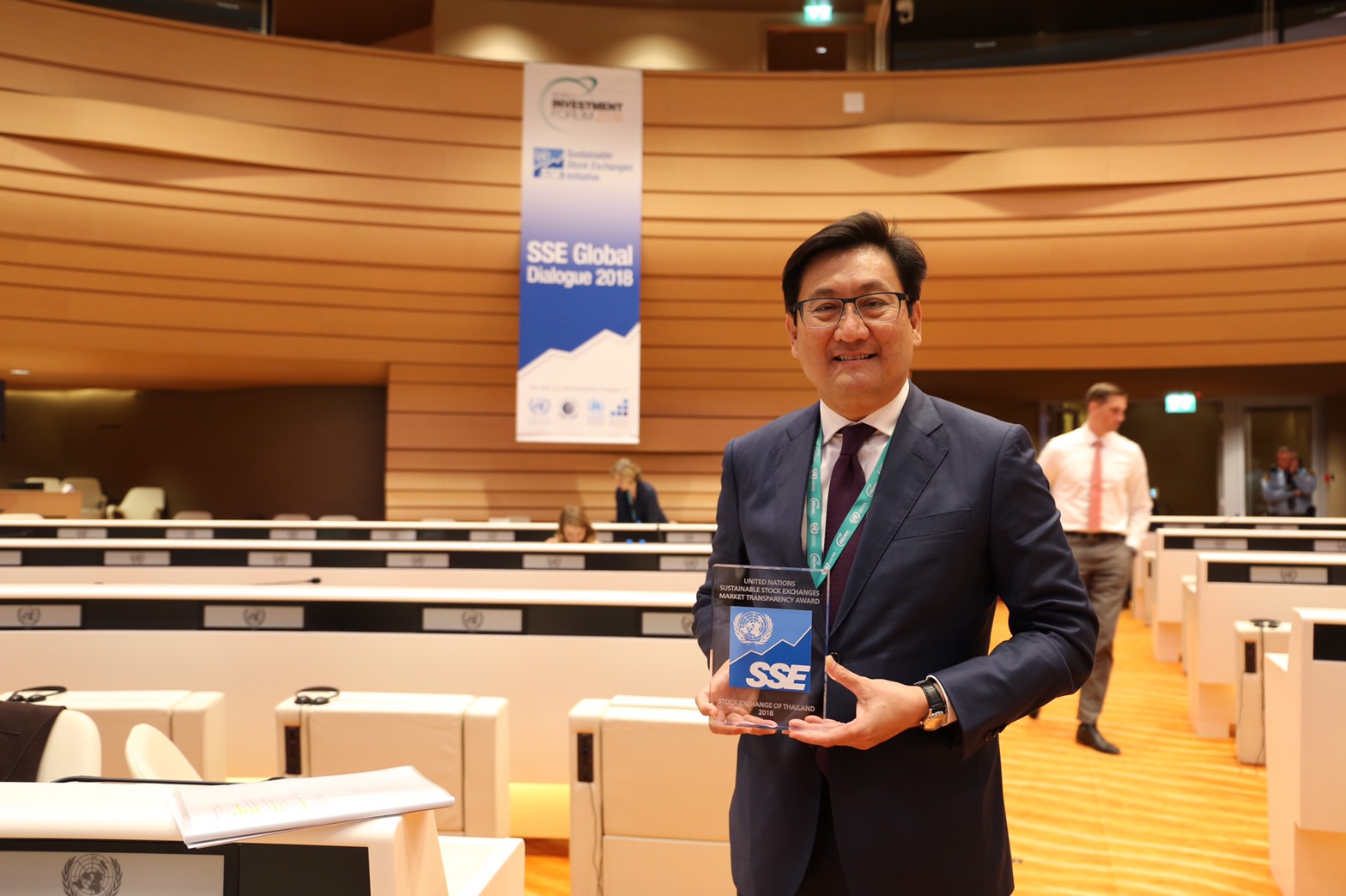 นายภากร ปีตธวัชชัย กรรมการและผู้จัดการ ตลาดหลักทรัพย์แห่งประเทศไทย (ตลท.) เปิดเผยว่า องค์การสหประชาชาติประกาศให้ตลาดหลักทรัพย์ฯ คว้ารางวัล “United Nations Sustainable Stock Exchanges Market Transparency Award” ในที่ประชุม SSE Global Dialogue ในงาน World Investment Forum (WIF) 2018 ที่กรุงเจนีวา ประเทศสวิตเซอร์แลนด์ ซึ่งเป็นผลจากการจัดอันดับตลาดหลักทรัพย์ที่มีบริษัทจดทะเบียน (บจ.) เปิดเผยข้อมูลด้านความยั่งยืนโดดเด่นและมีคุณภาพมากที่สุด ซึ่งตลาดหลักทรัพย์ไทยอยู่อันดับที่ 7 จากตลาดหลักทรัพย์ 35 แห่งทั่วโลก โดยเป็นที่หนึ่งในกลุ่มตลาดหลักทรัพย์เกิดใหม่ (Emerging Markets) และเป็นตลาดหลักทรัพย์เอเชียเพียงแห่งเดียวที่ติดอันดับ Top 10