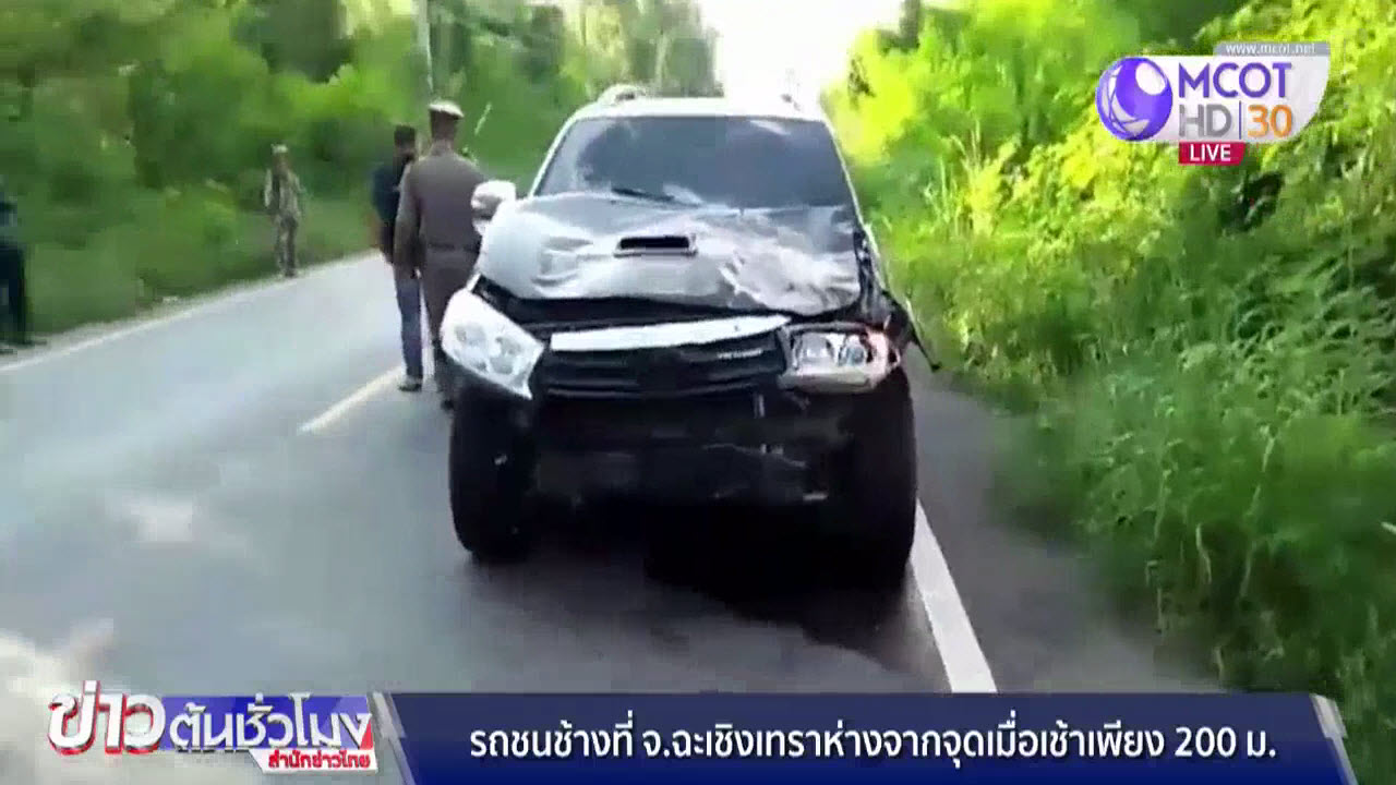 ฉะเชิงเทรา 27 ต.ค.-เกิดเหตุรถชนช้างป่า บนถนน 3259 บ้านสวนป่าพัฒนา ม. 5 ต.ราดกระทิง อ.สนามชัยเขต จังหวัดฉะเชิงเทราอีกแล้ว ห่างจากจุดเดิมที่เกิดอุบัติเหตุชนช้างเมื่อเช้าเพียง 200 เมตร โดยรถฟอร์จูนเนอร์ ของนายทวีศักด์ คำไทย ที่กำลังเดินทางจะไปทอดกฐินที่จังหวัดสระแก้ว ถูกช้างป่าวิ่งชนอย่างแรงจนรถพังยับ โชคดีไม่มีใครบาดเจ็บ ส่วนช้างได้เดินหนีเข้าป่าไป เจ้าหน้าที่ต้องช่วยอำนวยความสะดวกนำขบวนรถของชาวบ้านเดินทางไปทอดกฐินที่สระแก้วตามกำหนด ส่วนเจ้าของรถต้องรอรถมายกไปซ่อม
