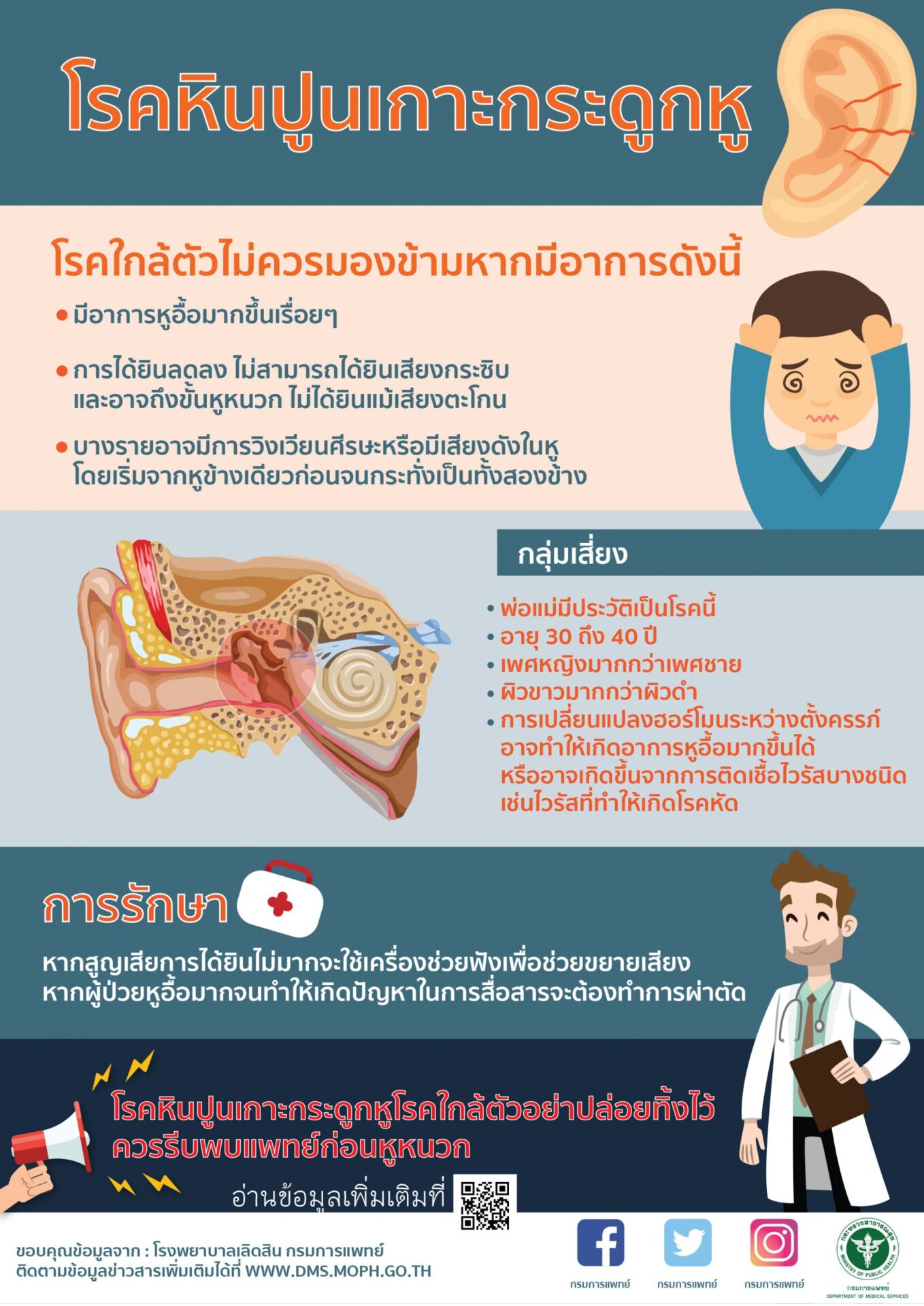 นายแพทย์สมศักดิ์ อรรฆศิลป์ อธิบดีกรมการแพทย์ เปิดเผยว่าโรคหินปูนเกาะกระดูกหู เป็นโรคที่เกิดจากหินปูนมีการเจริญเติบโตผิดปกติในหูชั้นกลาง ทำให้เสียงไม่สามารถผ่านหูชั้นกลางเข้าไปในหูชั้นในได้ตามปกติ ทำให้เกิดอาการหูอื้อหรือหูตึง และอาจเกิดเสียงดังในหู หรือเวียนศีรษะ บ้านหมุนได้ เนื่องจากมีหินปูนเจริญผิดที่ในหูชั้นใน หรือหินปูนที่ผิดปกติในหูชั้นกลางปล่อยเอนไซม์บางชนิดเข้าไปในหูชั้นใน สาเหตุของโรคยังไม่ทราบแน่ชัด แต่จากการศึกษาวิจัยพบว่าโรคนี้มีแนวโน้มถ่ายทอดทางพันธุกรรมจากคนในครอบครัว พ่อ แม่ มีประวัติเป็นโรคนี้ และพบในคนอายุ 30 – 40 ปี โดยพบในผู้หญิงมากกว่าผู้ชาย และคนผิวขาวมากกว่าคนผิวดำ นอกจากนี้ยังพบว่าการเปลี่ยนแปลงของฮอร์โมนระหว่างตั้งครรภ์ อาจทำให้เกิดอาการหูอื้อมากขึ้นได้ หรืออาจเกิดจากการติดเชื้อไวรัสบางชนิด เช่น ไวรัสที่ทำให้เกิดโรคหัด