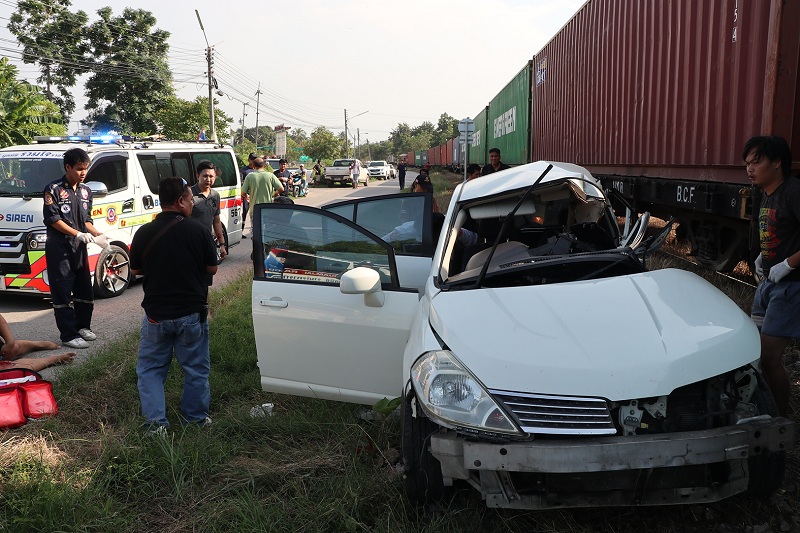 ราชบุรี 29 ต.ค.- คนขับเก๋งขาวพาครอบครัวมาเยี่ยมญาติไม่ทันสังเกตขณะแล่นผ่านจุดตัดทางรถไฟไม่มีเครื่องกั้นบริเวณบ้านโป่ง-ราชบุรี มีผู้เสียชีวิต 2 ราย เจ็บอีก 3