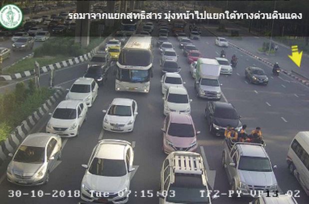 ถนนวิภาวดี-รังสิต ขาเข้า จากสุทธิสาร มุ่งหน้าใต้ทางด่วนดินแดง รถมาก เคลื่อนตัวช้า ท้ายสะสมหน้ามหาวิทยาลัยหอการค้าไทย