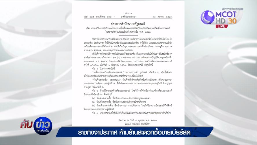 อสมท 30 ต.ค.-เว็บไซต์ราชกิจจานุเบกษา เผยแพร่ประกาศสำนักนายกรัฐมนตรี ห้ามใช้เครื่องจ่ายเครื่องดื่มแอลกอฮอล์ในร้านค้าสะดวกซื้อ มีผลวันพรุ่งนี้ (31 ต.ค.) เป็นต้นไป