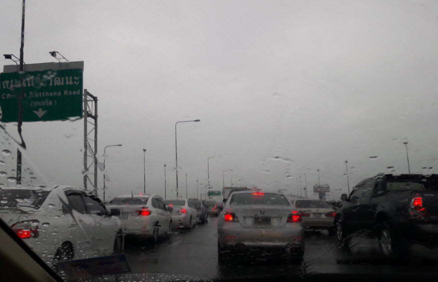 สภาพการจราจร ทางพิเศษศรีรัช (ทางด่วนขั้นที่ 2) จากแจ้งวัฒนะ มุ่งหน้างามวงศ์วาน ไปประชาชื่น รถหนาแน่นติดขัด ในเส้นทางมีฝนตก