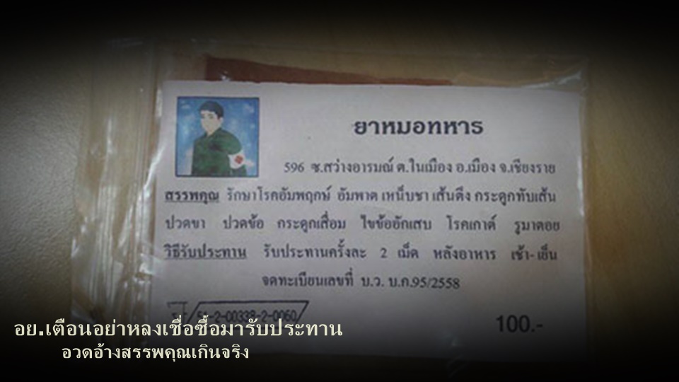นพ.สุรโชค ต่างวิวัฒน์ รองเลขาธิการคณะกรรมการอาหารและยา เปิดเผยว่า ตามที่มีข่าวปรากฏทางหน้าหนังสือพิมพ์กรณีพบยาชื่อ “หมอทหาร” วางขายตามต่างจังหวัดแถบภาคอีสาน ซึ่งพบว่ามีการอวดอ้างสรรพคุณเกินจริงในทางการรักษาโรคสารพัด เช่น อัมพฤกษ์ อัมพาต กระดูกทับเส้น ไขข้ออักเสบ โรคเกาต์ รูมาตอยด์ เป็นต้น สำนักงานคณะกรรมการอาหารและยา (อย.)มีความห่วงใยผู้บริโภคโดยเฉพาะวัยสูงอายุขอให้ระมัด ระวังเป็นพิเศษอย่าหลงเชื่อซื้อยาดังกล่าวมารับประทานโดยเด็ดขาด เนื่องจากยาที่โฆษณาอวดสรรพคุณรักษาได้สารพัดโรค มักมีการลักลอบใส่สาร สเตียรอยด์เพื่อให้ผู้ใช้เห็นผลได้ทันใจ ซึ่งยาสเตียรอยด์จัดเป็นยาควบคุมพิเศษ ต้องใช้ภายใต้การดูแลของแพทย์เท่านั้น เพราะเป็นยาที่มีผล ข้างเคียงสูง หากรับประทานเข้าไปในปริมาณมาก อาจทำให้เกิดการติดเชื้อโรคได้ง่าย เยื่อบุกระเพาะอักเสบ อาจถึงขั้นกระเพาะทะลุ กระดูกผุ ภูมิคุ้มกันลดลง ไตวายบางรายอาจเสียชีวิตได้