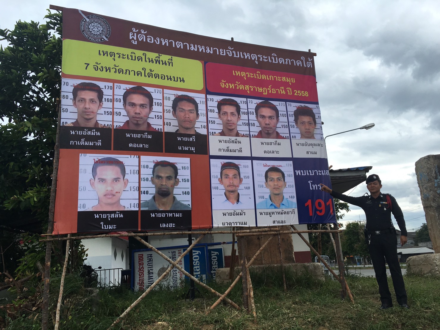 ประจวบคีรีขันธ์ 11 ก.ย.- ตำรวจสันติบาลขึ้นป้ายใหญ่ริมถนนเพชรเกษม หลัง สตช.ขอศาลออกหมายจับผู้ต้องหาคดีระเบิด 7 จังหวัด