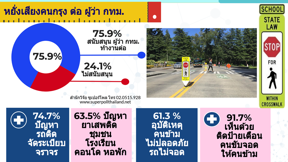 ส่วนสิ่งที่เป็นห่วง และอยากให้ผู้ว่าฯ กทม.เร่งแก้ไข ส่วนใหญ่หรือร้อยละ 74.7 ระบุปัญหารถติด จัดระเบียบจราจรทั้งระบบ รองลงมา คือ ร้อยละ 63.5 ระบุปัญหายาเสพติดในชุมชน โรงเรียน คอนโดฯ หอพัก ร้อยละ 61.3 ระบุแก้อุบัติเหตุ อันตรายคนข้าม รถไม่ยอมจอด สัญญาณไฟเสียบ่อย ร้อยละ 58.6 ระบุติดกล้องใหม่ ซ่อมกล้อง CCTV ที่ชำรุด ร้อยละ 55.7 ระบุมลพิษ คลองน้ำเน่า ขยะเน่าเหม็น รถขนขยะทำขยะตกหล่น พร้อมกันนี้ยังแสดงความคิดเห็นเกี่ยวกับการติดป้ายเตือนสติคนขับรถทุกทางข้าม (ทางม้าลาย) เพิ่มความปลอดภัยให้คนข้ามถนนบนทางข้ามว่า “ตามกฎหมาย ต้องหยุดรถให้คนข้ามบนทางข้าม (ทางม้าลาย)” พบว่า ร้อยละ 91.7 เห็นด้วย มีเพียงร้อยละ 8.3 ไม่เห็นด้วย