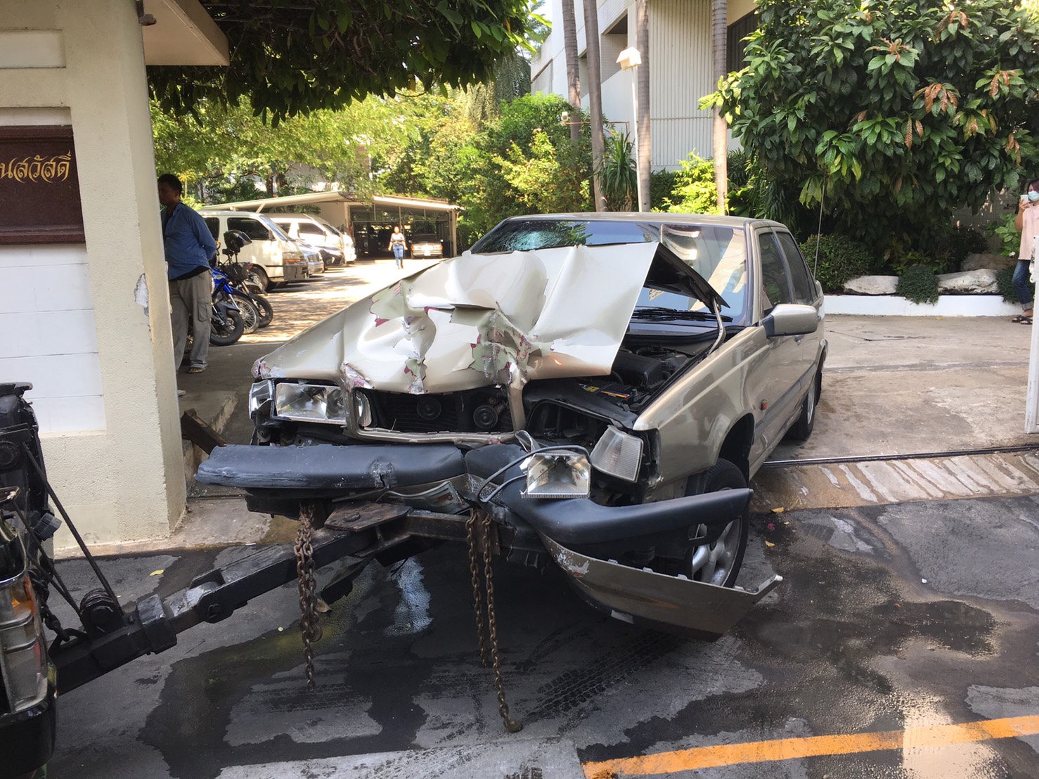 เจ้าหน้าท่ีมูลนิธิป่อเต๊กตึ้งและตำรวจ สน.พหลโยธิน เข้าตรวจสอบภาพรถวอลโว่ รุ่น 850 สีบอนด์ น้ำตาล หมายเลขทะเบียน 4 ฐ1661 กรุงเทพมหานคร ในสภาพหน้ารถพังยับเยิน หลังพุ่งชนรั้วบริษัทผงพิเศษ ตราร่มชูชีพและบริษัทสมจิตตต์ โอสถ จำกัด อีกทั้งหน้าบริษัท ยังมีป้ายชื่อ พลตำรวจเอกบุญศรี หุ่นสวัสดิ์ อดีตรองอธิบดีกรมตำรวจ