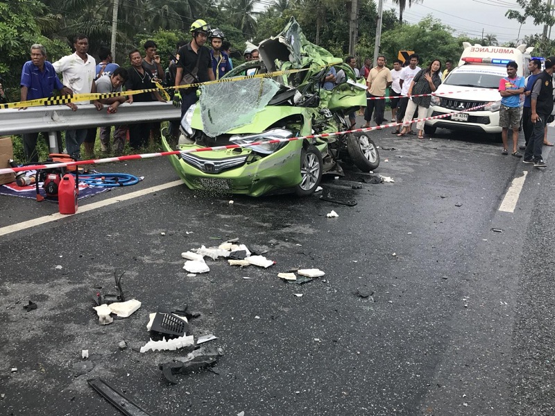 ร.ต.อ.สุวิทย์ ทองสุภา รอง สว.(สอบสวน) สภ.เมืองนครศรีธรรมราช พร้อมแพทย์โรงพยาบาลมหาราช และหน่วยกู้ภัยเข้าช่วยเหลืออุบัติเหตุรถชนกัน 3 คัน ช่วงสายวันนี้ (3 พ.ย.) บนถนนนคร-ปากพนัง เขตเทศบาลตำบลบางจาก พบรถยนต์ สีเขียว สภาพพังยับทั้งคัน คนขับเสียชีวิตติดอยู่ภายในเป็นหญิง อายุ 39 ปี ใกล้กันเป็นรถพ่วง 18 ล้อ และรถจักรยานยนต์คนขับหญิงเป็นได้รับบาดเจ็บถูกนำส่งโรงพยาบาลมหาราช