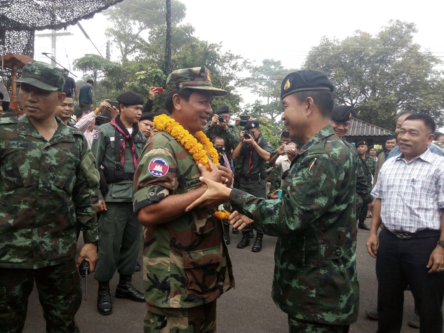 ศรีสะเกษ 11 ส.ค.- ชายแดนเขาพระวิหารสุดชื่นมื่น คณะทหารกัมพูชาร่วมกิจกรรมกองกำลังสุรนารีชมดนตรีเชื่อมสัมพันธ์บนผามออีแดง