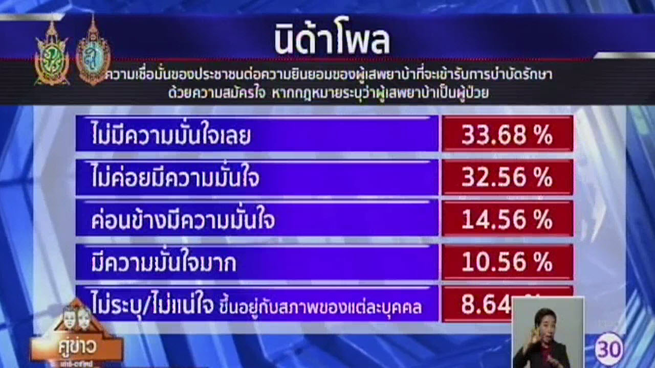 ท้ายที่สุด เมื่อถามถึงความคิดเห็นของประชาชน ต่อแนวคิดการให้ยาเสพติดบางชนิดถูกนำมาใช้โดยถูกกฎหมาย พบว่าประชาชนส่วนใหญ่ร้อยละ 49.20 ระบุว่าไม่เห็นด้วยกับแนวคิดการให้ยาเสพติดทุกชนิดถูกนำมาใช้โดยถูกกฎหมายได้ รองลงมาร้อยละ 38.48 ระบุว่า เห็นด้วยกับการเปลี่ยนใบกระท่อมให้เป็นยา ร้อยละ 38.16 ระบุว่าเห็นด้วยกับการเปลี่ยนกัญชาให้เป็นยาสมุนไพร และอนุญาตให้ใช้ในทางการแพทย์ ร้อยละ 15.60 ระบุว่าเห็นด้วยกับการเปลี่ยนยาบ้าให้เป็นสารเสพติด ที่อนุญาตให้ใช้ในทางการแพทย์ และร้อยละ 2.88 ไม่ระบุ/ไม่แน่ใจ เพราะสารเสพติดแต่ละอย่างต่างมีทั้งข้อดี-ข้อเสีย และข้อจำกัดปริมาณการใช้ .-สำนักข่าวไทย