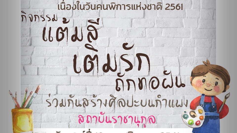 สถาบันราชานุกูล แจ้งว่าในวันเสาร์ที่ 10 พ.ย.นี้ ทางสถาบันร่วมกับหลายหน่วยงานจัดกิจกรรม “แต้มสี เติมรัก ถักทอฝัน : ศิลปะบนกำแพงสถาบันราชานุกูล”ความยาวของกำแพง 225 เมตร เนื่องในวันคนพิการแห่งชาติ โดยร่วมกับแผนงานสร้างเสริมวัฒนธรรมการอ่าน สสส. เครือข่ายการ์ตูนไทยสร้างสรรค์สังคม มูลนิธิเพื่อการพัฒนาเด็ก (มพด.) และจิตอาสาฯ ซึ่งเป็นครั้งแรกที่ผู้บกพร่องทางสติปัญญาได้ทำงานร่วมกับนักวาดการ์ตูน นักเขียนหนังสือนิทาน และจิตอาสาโดยใช้ศิลปะเป็นสื่อกลางเพื่อสร้างกำลังใจแก่ผู้พิการทุกประเภท