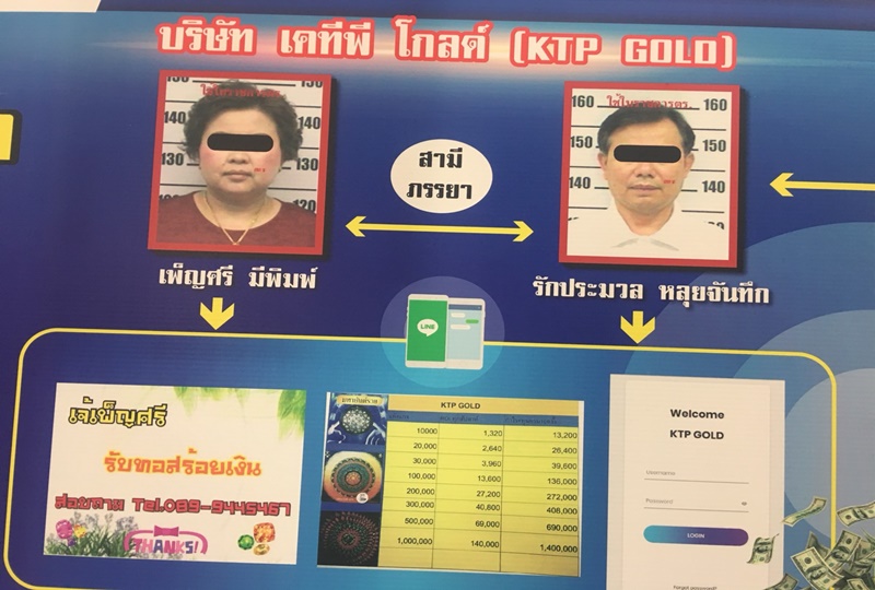 พลตำรวจตรีสุรเชษฐ์ หักพาล รักษาราชการแทนผู้บัญชาการสำนักงานตรวจคนเข้าเมือง ในฐานะรองผู้อำนวยการศูนย์ปราบปรามอาชญากรรมเทคโนโลยีสารสนเทศ สำนักงานตำรวจแห่งชาติ แถลงจับกุม นางเพ็ญศรี มีพิมพ์ และนายรักประมวล หลุยจันทึก 2 สามีภรรยา เจ้าของบริษัท เคทีพีโกลด์ ในข้อหา ร่วมกันฉ้อโกงและร่วมกันกู้ยืมเงินที่เป็นการฉ้อโกงประชาชน โดยหลอกให้ผู้เสียหายร่วมลงทุนแปรสภาพทองคำแท่งเป็นทองคำรูปพรรณ โฆษณาผ่านเว็บไซต์ “ WWW.KTPGOLD.COM ” อ้างจะได้รับผลตอบแทน 200-300% ต่อปี หากสนใจร่วมลงทุนได้ ซึ่งจะแบ่งออกเป็น 2 แบบ 1.ร่วมลงทุนรับรายได้แบบรายวัน เช่น ลงทุน1ล้านบาท กำไรตอบแทนคืน 25,000บาท คิดเป็น 25% ต่อเดือนเฉลี่ย300%ต่อปี และ 2.ร่วมลงทุนรับรายได้แบบรายสัปดาห์ เช่นลงทุน1ล้านบาท ได้ตอบแทนคืนสัปดาห์ละ140,000บาท เฉลี่ยกำไร 200 %/ปี และยังระบุอีกว่าหากหาคนมาเพิ่มร่วมลงทุนจะรับค่าคอมมิชชั่น 6% ทำให้มีประชาชนสนใจและร่วมลงทุนกว่า100ราย ซึ่งช่วงแรกผู้ลงทุนได้รับผลตอบแทนปกติตรงเวลา ผู้เสียหายจึงไว้ใจลงทุนเพิ่ม หลังจากนั้นกลับไม่ได้ผลตอบแทนตามที่กำหนด และเมื่อสอบถามไปยังผู้ต้องหา ก็อ้างว่าถูกเจ้าหน้าที่ตรวจสอบอายัดบัญชี เนื่องจากถูกสงสัยว่าฟอกเงิน แต่ผู้เสียหายไม่เชื่อจึงมาแจ้งความกับเจ้าหน้าที่ตำรวจเบื้องต้นมูลค่าความเสียหายกว่า 200 ล้านบาท