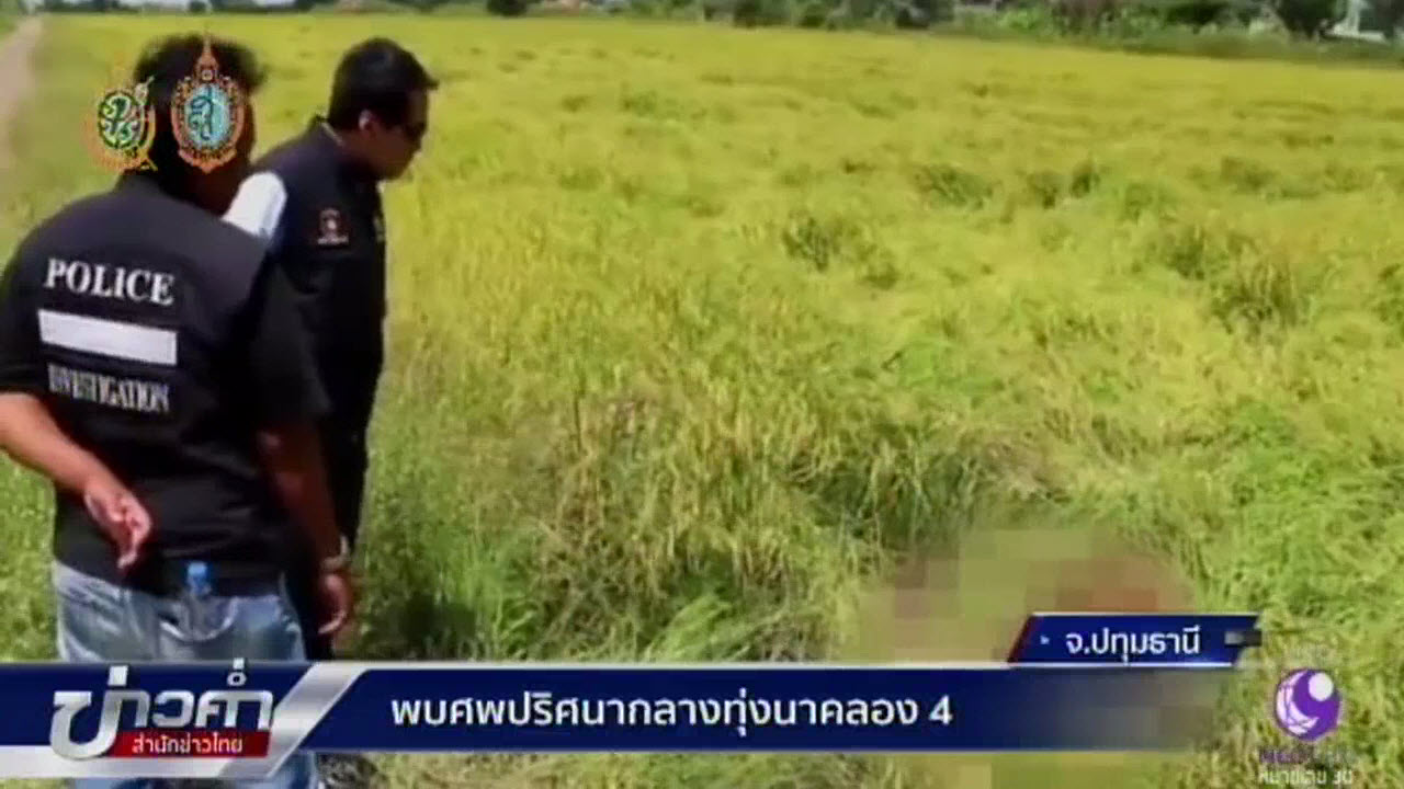 ปทุมธานี 10 ก.ย.-พบศพปริศนากลางทุ่งนาคลองสี่ ปทุมธานี เจ้าหน้าที่ติดตามตัวผู้แจ้งความคนหายจึงพบมารดาผู้เสียชีวิต เบื้องต้นหายตัวไปตั้งแต่ 30 สิงหาคมที่ผ่านมา กระทั่งกลายเป็นศพโดยไม่ทราบสาเหตุ