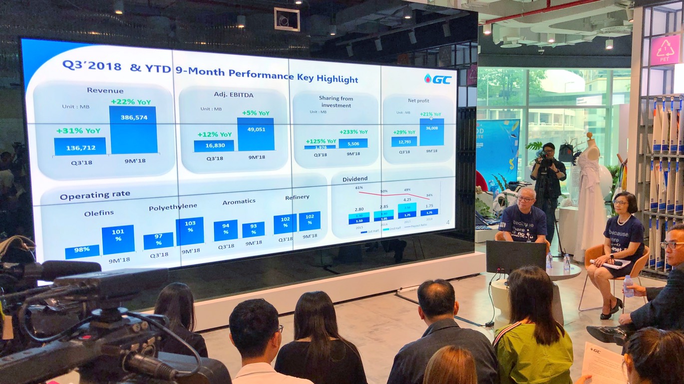 นายสุพัฒนพงษ์ พันธ์มีเชาว์ ประธานเจ้าหน้าที่บริหารและกรรมการผู้จัดการใหญ่ บริษัท พีทีที โกลบอล เคมิคอล จำกัด (มหาชน) (CEO) GC เปิดเผยว่า ไตรมาส 3/2561 บริษัทฯ มีผลการดำเนินการดีขึ้นจากไตรมาสก่อนหน้า โดยมีรายได้จากการขาย 136,712 ล้านบาท ปรับตัวเพิ่มขึ้นร้อยละ 6 มี Adjusted EBITDA 16,830 ล้านบาท และมีกำไรสุทธิรวม 12,793 ล้านบาท (2.84 บาท/หุ้น) ปรับตัวเพิ่มขึ้นร้อยละ 6 และร้อยละ 18 ตามลำดับ และเมื่อเปรียบเทียบกับไตรมาส 3/2560 บริษัทฯ มีรายได้จากการขายปรับตัวเพิ่มขึ้นร้อยละ 31 ขณะที่ Adjusted EBITDA และกำไรสุทธิรวม ปรับตัวเพิ่มขึ้นร้อยละ 12 และร้อยละ 29 ตามลำดับ สำหรับผลการดำเนินงาน 9 เดือนแรกของปี 2561 บริษัทฯ มีกำไรสุทธิรวม 36,008 ล้านบาท ปรับตัวเพิ่มขึ้นร้อยละ 21 จากช่วงเดียวกันของปีก่อน สูงที่สุดเป็นประวัติการณ์