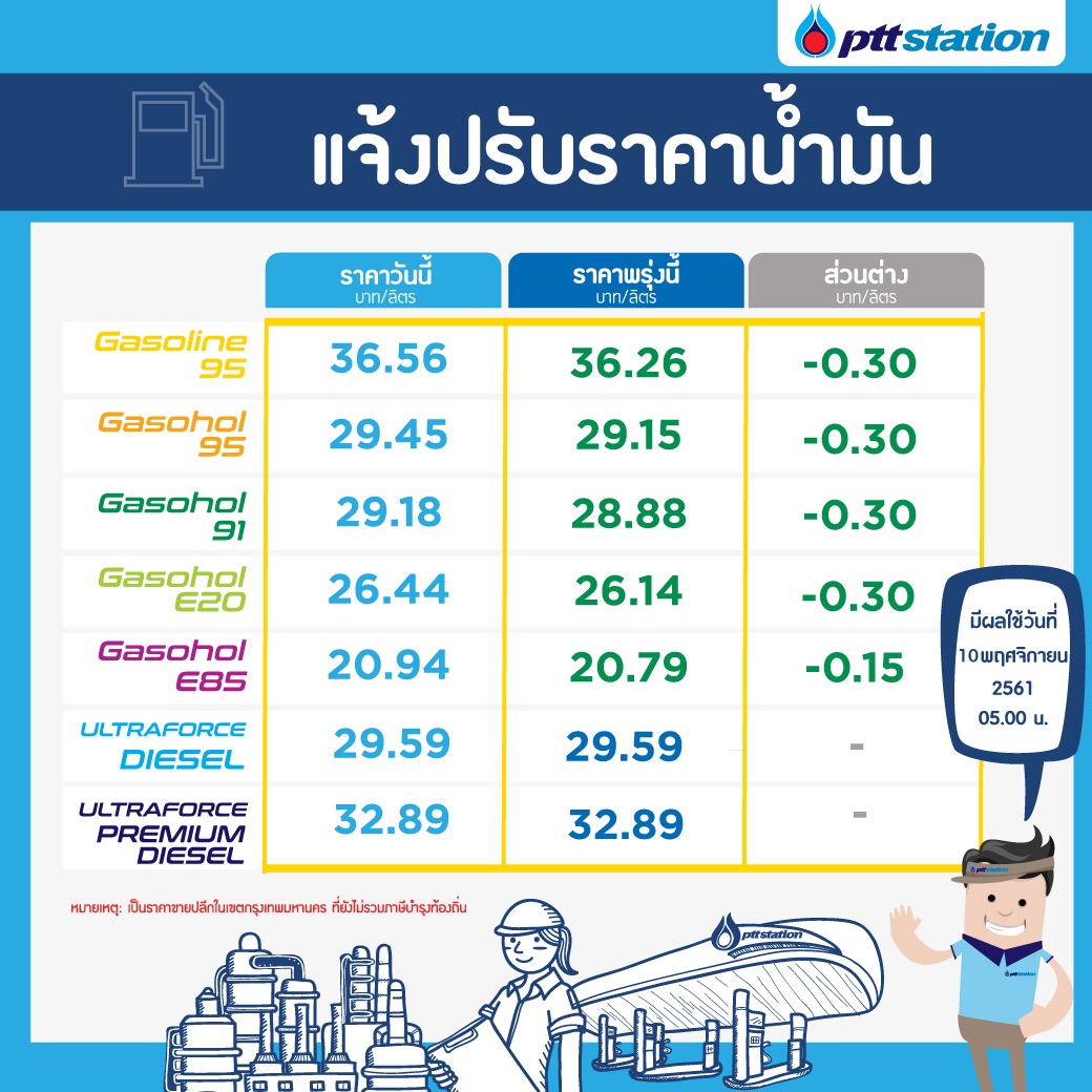 ปตท.-บางจากฯ ปรับราคาขายปลีกน้ำมันเบนซินและแก๊สโซฮอล์ลง 30 สตางค์ ยกเว้น E85 ลด 15 สตางค์ต่อลิตร และกลุ่มดีเซลราคาคงเดิม มีผล 10 พฤศจิกายนนี้ เวลา 05.00 น. โดยราคาใหม่ดังนี้ เบนซิน 95 ลิตรละ 36.26 บาท แก๊สโซฮอล์ 95 ลิตรละ 29.15 บาท แก๊สโซฮอล์ 91 ลิตรละ 28.88 บาท E 20 ลิตรละ 26.14 บาท E85 ลิตรละ 20.79 บาท และดีเซล 29.59 บาท โดยราคาขายปลีกข้างต้นยังไม่รวมภาษีบำรุงกรุงเทพมหานคร.-สำนักข่าวไทย