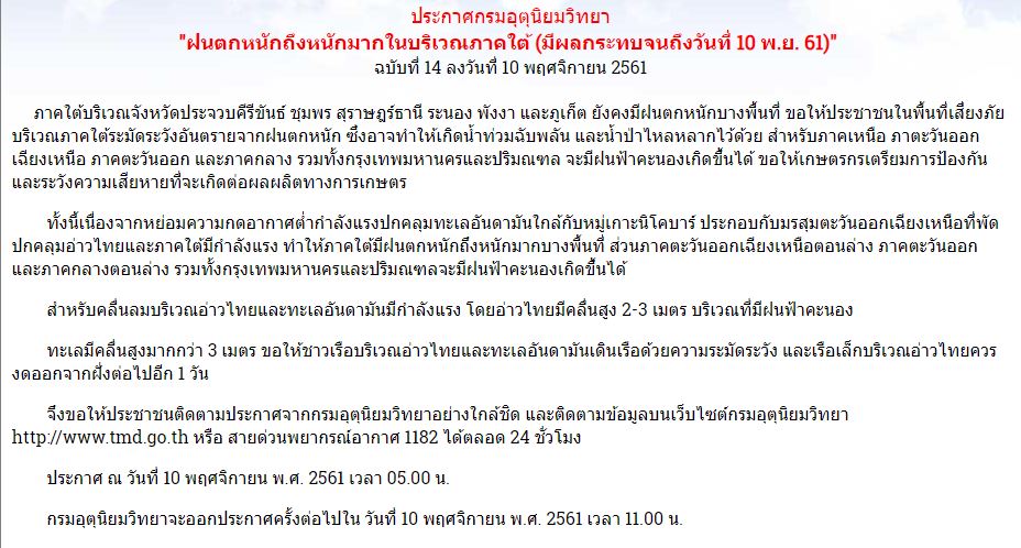 กรมอุตุนิยมวิทยาประกาศเตือนฉบับที่ 14 เรื่อง “ฝนตกหนักถึงหนักมากในบริเวณภาคใต้ มีผลกระทบจนถึงวันนี้ (10 พ.ย.61) ภาคใต้บริเวณจังหวัดประจวบคีรีขันธ์ ชุมพร สุราษฎร์ธานี ระนอง พังงา และภูเก็ต ยังคงมีฝนตกหนักบางพื้นที่ ขอให้ประชาชนในพื้นที่เสี่ยงภัยบริเวณภาคใต้ระมัดระวังอันตรายจากฝนตกหนัก อาจทำให้เกิดน้ำท่วมฉับพลัน และน้ำป่าไหลหลาก