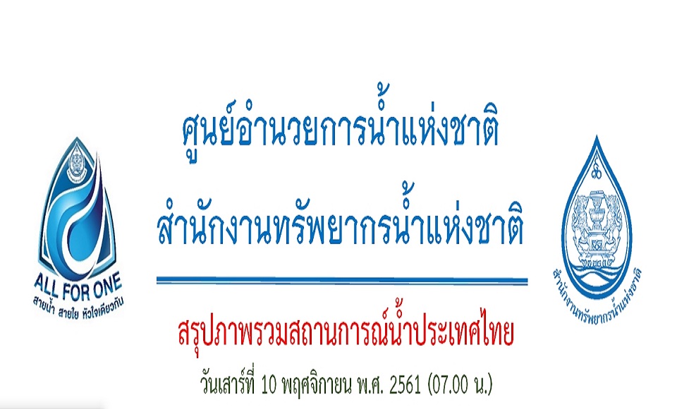 ศูนย์อำนวยการน้ำแห่งชาติ สำนักงานทรัพยากรน้ำแห่งชาติ สรุปภาพรวมสถานการณ์น้ำประเทศไทย วันเสาร์ที่ 10 พฤศจิกายน พ.ศ. 2561 ณ 07.00 น. ว่า สภาพอากาศ และฝน : วันนี้ภาคใต้ยังคงมีฝนตกหนักบางพื้นที่ บริเวณจังหวัดเพชรบุรี ประจวบคีรีขันธ์ ชุมพร สุราษฎร์ธานี ระนอง พังงา และภูเก็ต สำหรับปริมาณฝน 24 ชั่วโมงที่ผ่านมามีฝนตกหนักมากในพื้นที่ 4 จังหวัด ได้แก่ จ.ประจวบคีรีขันธ์ (182 มม.) สุราษฎร์ธานี (166.5 มม.) ชุมพร (163.2 มม.) และ จ.นครศรีธรรมราช (150 มม.) สถานการณ์น้ำภาคใต้ : จากอิทธิพลหย่อมกดอากาศต่ำกำลังแรงปกคลุมชายฝั่งภาคใต้ตอนล่างส่งผลให้ฝนตกหนักใน 2 วันที่ผ่านมาก่อให้เกิดภาวะน้ำท่วมขังพื้นที่ลุ่มต่ำ ประกอบกับอิทธิพลน้ำทะเลหนุนทำให้น้ำระบายลงสู่ทะเลได้ช้าลง ปัจจุบันสถานการณ์น้ำท่วมขังและระดับน้ำสูงกว่าระดับตลิ่งในพื้นที่ จ.เพชรบุรี จ.ประจวบคีรีขันธ์ และชุมพร เข้าสู่ภาวะปกติแล้ว ยกเว้นที่ อ.บางสะพาน จ.ประจวบคีรีขันธ์ ระดับน้ำสูงกว่าระดับตลิ่ง 0.81 ม. แนวโน้มลดลง ส่วนอ่างเก็บน้ำขนาดใหญ่ในพื้นที่ดังกล่าว ได้แก่ อ่างฯ แก่งกระจาน จ.เพชรบุรี ปริมาตรน้ำในอ่างฯ คิดเป็น90 ปริมาณน้ำไหลลงอ่างฯ 2.70 ล้าน ลบ.ม./วัน ปริมาณน้ำระบาย 3.46 ล้าน ลบ.ม./วัน ปริมาณน้ำไหลลงอ่างฯ ในช่วง 1-2 วัน มีแนวโน้มคงเดิม และ อ่างฯ ปราณบุรี จ.ประจวบคีรีขันธ์ ปริมาตรน้ำในอ่างฯ คิดเป็น 83 ปริมาณน้ำไหลลงอ่างฯ 3.83 ล้าน ลบ.ม./วัน ปริมาณน้ำระบาย 2.36 ล้าน ลบ.ม./วัน ปริมาณน้ำไหลลงอ่างฯ ในช่วง 1-2 วัน มีแนวโน้มเพิ่มขึ้นเล็กน้อยแต่อยู่ในเกณฑ์ที่ควบคุมได้ ทั้งนี้ ปภ. ทหารในพื้นที่ โครงการชลประทาน อปท. และหน่วยงานที่เกี่ยวข้อง ได้เร่งให้การช่วยเหลือและสนับสนุนเครื่อง สูบน้ำ เครื่องจักรกลอื่นๆ เพื่อระบายน้ำในพื้นที่
