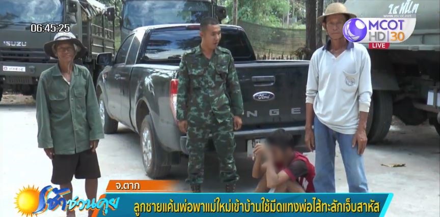 ตาก 12 พ.ย. – ลูกชายแค้นพ่อพาแม่ใหม่เข้าบ้าน ก่อเหตุใช้มีดดาบแทงพ่อบาดเจ็บสาหัส ก่อนหลบหนีซ่อนตัวหลายชั่วโมงในป่าช้า สุดท้ายทนการปิดล้อมไม่ไหวมอบตัว สารภาพไม่ได้ตั้งใจจะก่อเหตุ แต่พ่อคว้ามีดดาบไล่แทงก่อน และรับไม่ได้ที่พ่อจะเอาแม่ใหม่เข้ามาแทนแม่