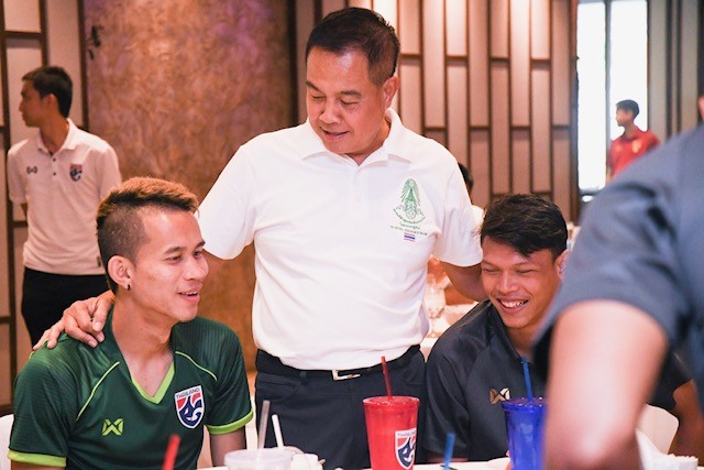 พร้อมกับให้โอวาท ให้กำลังใจแก่สตาฟฟ์โค้ชและนักฟุตบอลทีมชาติไทยชุดใหญ่