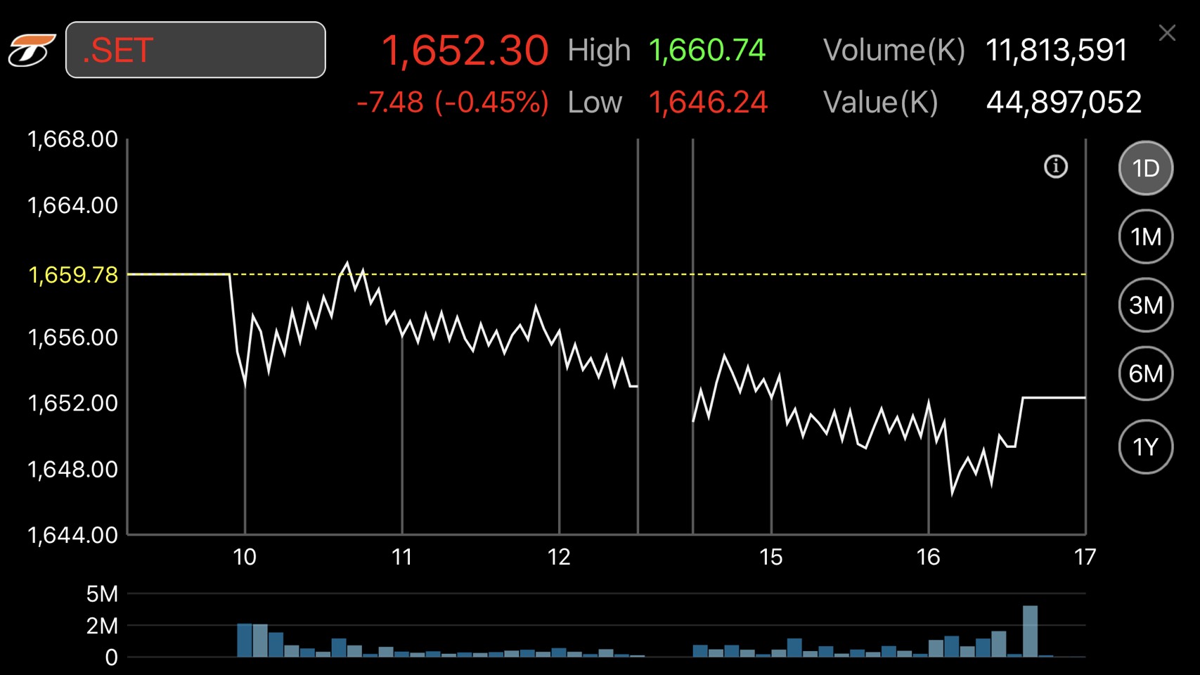 การเคลื่อนไหวของดัชนีวันนี้หลุดระดับ 1,650 จุด ต่ำสุดของวันที่ 1,646.24 จุด และสูงสุดของวันที่ระดับ 1,660.74 จุด ขณะที่การประชุมคณะกรรมการนโยบายการเงิน (กนง.) มีมติ 4:3 ให้คงอัตราดอกเบี้ยนโยบายไว้ในระดับเดิมที่ร้อยละ 1.50 แม้เป็นไปตามตลาดคาดการณ์ แต่เสียงของกรรมการที่ให้ปรับขึ้นดอกเบี้ยเพิ่มเป็น 3 เสียง จากการประชุมรอบที่แล้วที่มี 2 เสียง