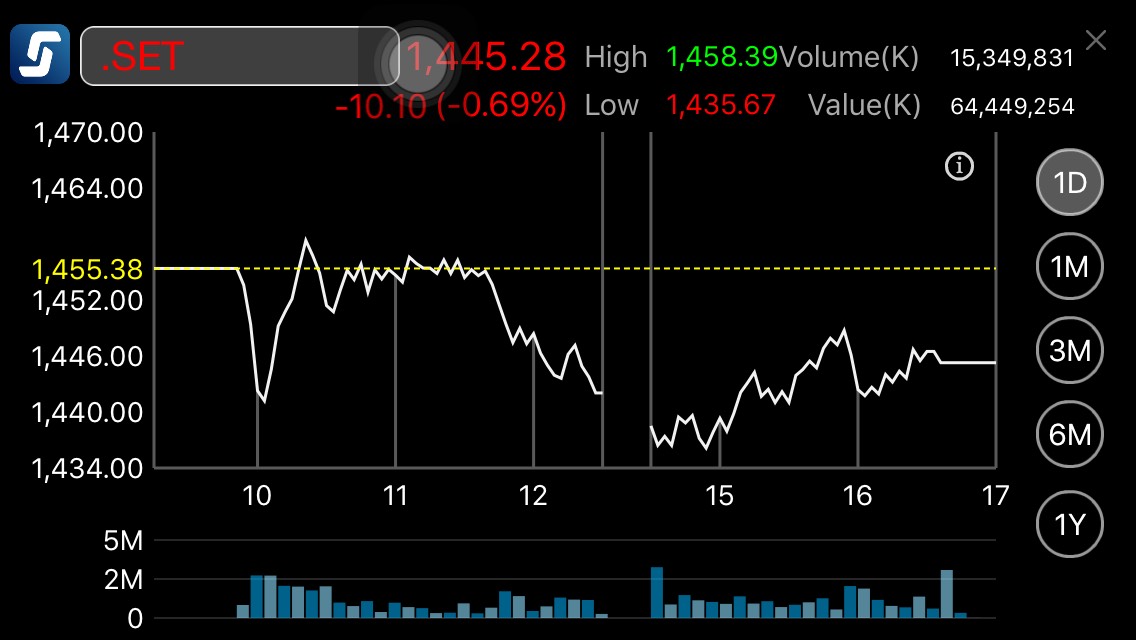 การซื้อขายหุ้นวันนี้ ดัชนีหุ้นไทยเคลื่อนไหวในแดนลบเป็นส่วนใหญ่ โดยระหว่างวันดัชนีขยับขึ้นแตะจุดสูงสุดที่ระดับ 1,458.39 จุด ส่วนดัชนีจุดต่ำสุดของวันอยู่ที่ 1,435.67 จุด