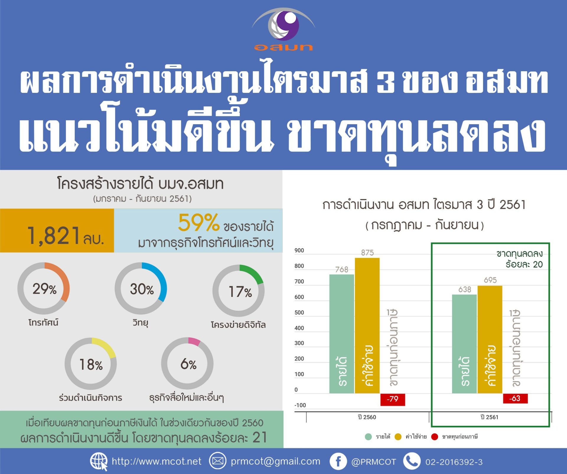 สำหรับผลการดำเนินงานในไตรมาส 3 ปี 2561 มีดังนี้ ธุรกิจโทรทัศน์ เป็นรายได้จำนวน 199 ล้านบาท เพิ่มขึ้นร้อยละ 12 จากไตรมาสก่อนหน้า ธุรกิจวิทยุ มีรายได้จำนวน 185 ล้านบาท ลดลงร้อยละ 3 จากไตรมาสก่อนหน้า ธุรกิจการให้บริการโครงข่ายโทรทัศน์ระบบดิจิทัล (BNO) มีรายได้จำนวน 109 ล้านบาท เพิ่มขึ้นจากช่วงเดียวกันของปี 2560 ร้อยละ 6 ส่วนหนึ่งเป็นรายได้ที่เพิ่มขึ้นของค่าบริการสิ่งอำนวยความสะดวก หลังจากที่ บมจ.อสมท มีข้อยุติจากการเจรจากับลูกค้าที่ค้างชำระการใช้บริการโครงข่ายฯ เป็นผลให้ลูกค้ายังยืนยันที่จะใช้บริการโครงข่ายฯ ของ บมจ.อสมท ต่อไป และเริ่มมีการชำระหนี้ค้างเก่าเข้ามา ทำให้รายการบัญชีหนี้สงสัยจะสูญก็จะลดลงตามเช็คที่ถึงกำหนดชำระ ธุรกิจใหม่ มีรายได้จำนวน 24 ล้านบาท เพิ่มขึ้นจากไตรมาสก่อน ร้อยละ 17 และเพิ่มขึ้นจากช่วงเดียวกันของปี 2560 ถึงร้อยละ 41 เป็นผลจากการเพิ่มขึ้นของรายได้จากการผลิตสื่อ Social Media ทาง Line Official Account สำหรับรายได้จากธุรกิจด้านดิจิทัล ไม่ว่าจะเป็นเว็บไซต์ www.mcot.net หรือแพลตฟอร์มโซเชียลที่ได้รับความนิยมต่างๆ เช่น Youtube และ Facebook บมจ.อสมท เร่งพัฒนาและต่อยอดใช้ทรัพยากรที่มีอยู่ให้เกิดประโยชน์สูงสุด (Maximize utilization) โดยการสร้างรายได้จากการนำคอนเทนต์ที่บริษัทเป็นเจ้าของลิขสิทธิ์ไปเผยแพร่บนแพลตฟอร์มต่างๆ