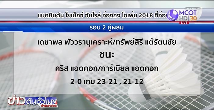 การแข่งขันแบดมินตัน โยเน็กซ์ ซันไรส์ ฮ่องกง โอเพ่น 2018 ที่เขตปกครองพิเศษฮ่องกง รอบ 2 ประเภทคู่ผสม “บาส” เดชาพล พัววรานุเคราะห์ กับ “ปอป้อ” ทรัพย์สิรี แต้รัตนชัย เอาชนะ คู่สามีภรรยาจากอังกฤษ คริส แอดคอก กับการ์เบียล แอดคอก 2 เกมรวด 23 ต่อ 21 และ 21 ต่อ 12 ประเภทคู่ผสม “ต้นน้ำ” นิพิฐพนธ์ พวงพั่วเพชร กับ “เอ็มเอ็ม”สาวิตรี อมิตรพ่าย ชนะ โรนัล กับ แอนนิสา ซูฟิกา จากอินโดนีเซีย 2 เกมรวด 21 ต่อ14 และ 21 ต่อ 14