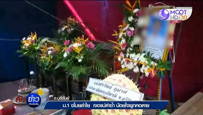 ขณะนี้ศพเด็กชายคนดังกล่าว ได้ตั้งบำเพ็ญกุศลอยู่ที่บ้านพัก ในตำบลตาเป็ก อำเภอเฉลิมพระเกียรติ จังหวัดบุรีรัมย์ ซึ่งบรรยากาศเต็มไปด้วยความโศกเศร้า โดยเฉพาะพ่อแม่ของผู้เสียชีวิต ญาติของเด็กเล่าให้ฟังว่า เหตุการณ์เกิดขึ้นเมื่อช่วงเย็นวันที่ 15 พ.ย.ที่ผ่านมา หลังจากเลิกเรียนผู้ตายและเพื่อนรวมทั้งหมด 7 คนพากันแอบไปขโมยลำไยในสวนลำไยของชาวบ้านที่ปลูกไว้ แต่ไม่รอด ถูกเจ้าของสวนจับได้ และพาส่งตำรวจ จากนั้นผู้ปกครองของเด็กทั้งหมดได้มาเจรจาไกล่เกลี่ยและชดใช้ค่าเสียหาย เจ้าของสวนไม่ติดใจเอาความ เพราะเห็นว่ายังเป็นเด็ก ตำรวจจึงปล่อยตัวเด็กทั้งหมดกลับบ้าน แต่ปรากฏว่าเมื่อกลับมาถึงบ้าน กลับถูกผู้ปกครองต่อว่าตักเตือนว่าเป็นสิ่งไม่ดี แต่ก็ไม่ได้ลงโทษอะไร และปล่อยให้ขึ้นไปอาบน้ำนอนตามปกติ กระทั่งเวลาประมาณ 21.00 น. ด้วยความเป็นห่วง พ่อของเด็กได้ขึ้นไปดูบุตรชาย ถึงกับช็อกเมื่อเห็นบุตรชายใช้เชือกไนล่อนสีแดง ผูกคอตัวเองกับขื่อบ้าน จึงรีบอุ้มร่างลงมา พาส่งโรงพยาบาล แต่ก็ไม่สามารถช่วยได้ทัน เพราะเด็กเสียชีวิตไปแล้ว สร้างความเสียใจให้กับผู้เป็นพ่อและแม่เป็นอย่างมาก โดยแม่ได้กอดร่างไร้วิญญาณของลูกชายร้องไห้ปานจะขาดใจ เพราะทำใจไม่ได้ที่ต้องสูญเสียลูกชายเพียงคนเดียวไป