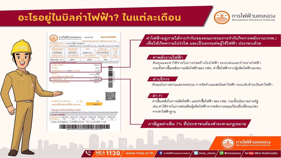 การไฟฟ้านครหลวง (กฟน.) ชี้แจงรายละเอียดการเรียกเก็บค่าบริการเพิ่มเติมที่ปรากฏบนใบแจ้งค่าไฟฟ้าเป็นการเปิดเผยข้อมูลค่าไฟฟ้าโดยละเอียดปกติ ไม่ใช่การเรียกเก็บค่าบริการเพิ่มเติมแต่อย่างใด ผู้ใช้ไฟฟ้าสามารถตรวจสอบอัตราการใช้ไฟฟ้าของตนเองได้โดยสะดวก ซึ่ง กฟน.มีการปรับปรุงใบแจ้งค่าไฟฟ้ามาตั้งแต่ปี 2543 ประกอบด้วย ค่าพลังงานไฟฟ้า ค่าบริการรายเดือน ค่าไฟฟ้าผันแปร (เอฟที) และภาษีมูลค่าเพิ่ม ส่วนค่าบริการรายเดือน เป็นค่าใช้จ่ายการอ่านและจดหน่วยการใช้ไฟฟ้า การจัดทำและจัดส่งใบแจ้งค่าไฟฟ้า รวมทั้งการรับชำระเงินค่าไฟฟ้า ทั้งนี้ ค่าไฟฟ้าที่เรียกเก็บจากผู้ใช้ไฟฟ้าอยู่ภายใต้การกำกับดูแลของคณะกรรมการกำกับกิจการพลังงาน (กกพ.)